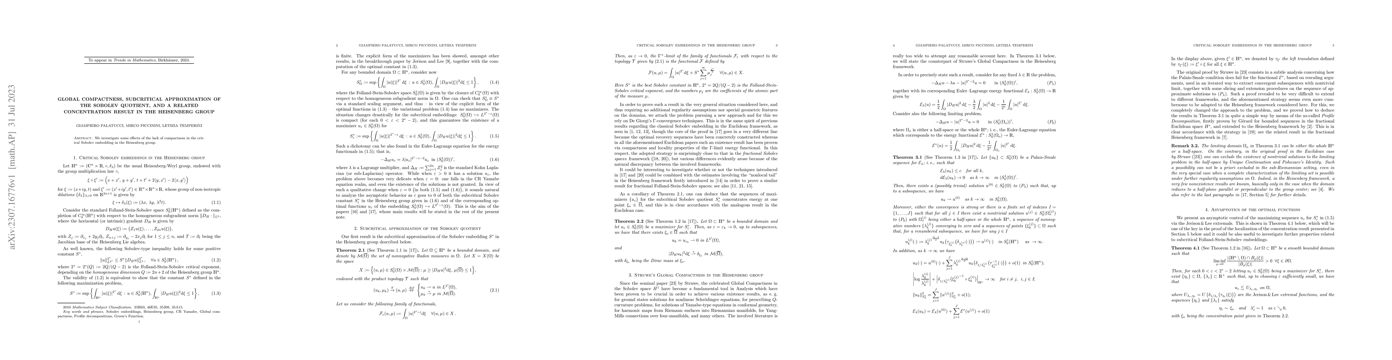 Summary: This paper explores the implications of non-compactness in the critical Sobolev embedding within the Heisenberg group, focusing on subcritical approximations of the Sobolev quotient and related concentration phenomena.