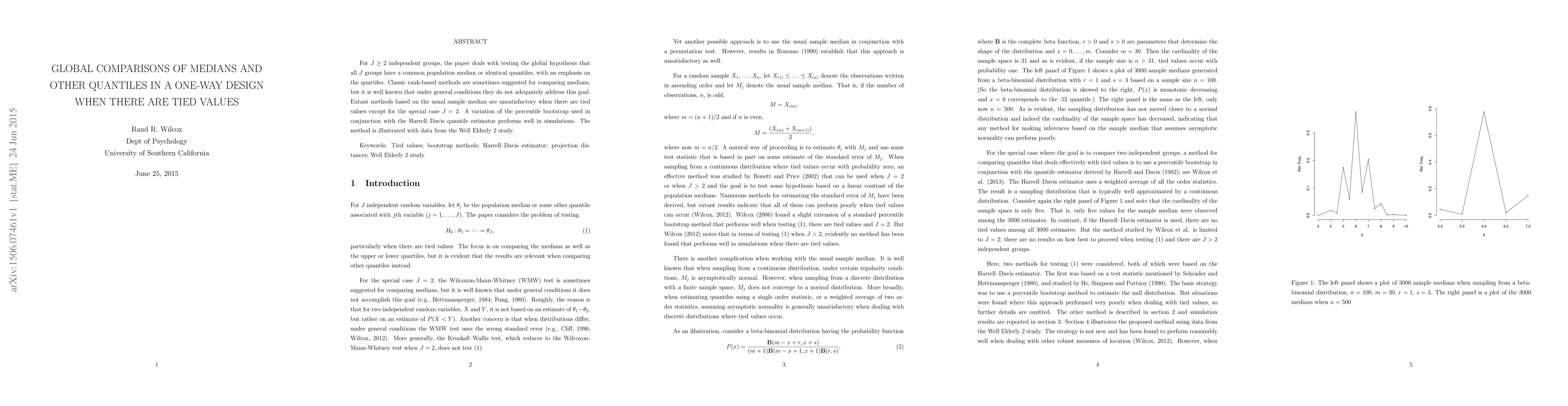 For $J \ge 2$ independent groups, the paper deals with testing the global hypothesis that all $J$ groups have a common population median or identical quantiles, with an emphasis on the quartiles. Classic rank-based methods are sometimes suggested for comparing medians, but it is well known that under general conditions they do not adequately address this goal. Extant methods based on the usual sample median are unsatisfactory when there are tied values except for the special case $J=2$. A variation of the percentile bootstrap used in conjunction with the Harrell--Davis quantile estimator performs well in simulations. The method is illustrated with data from the Well Elderly 2 study.