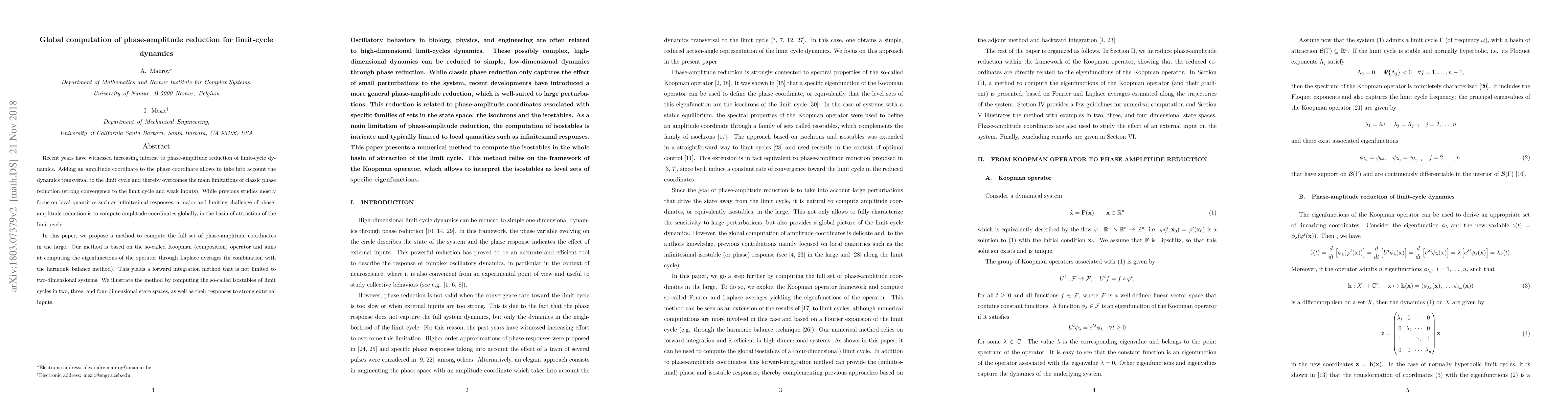 This paper introduces a novel method for globally computing phase-amplitude reduction for limit-cycle dynamics using the Koopman operator and Laplace averages. The proposed approach extends beyond local analysis and computes eigenfunctions for systems in multiple dimensions, demonstrating its application through isostability computations and responses to external inputs.