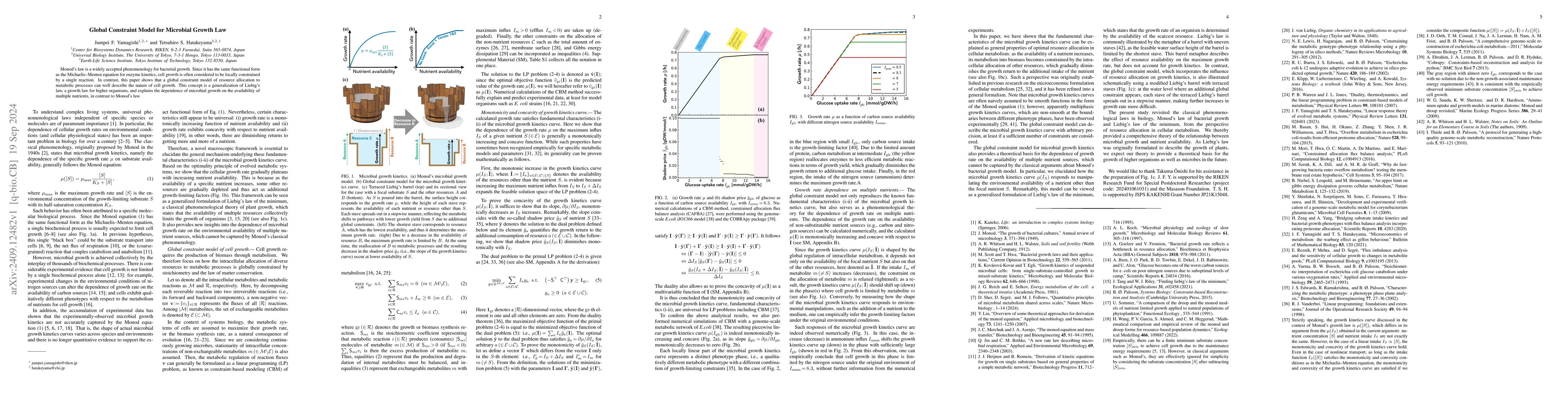 This paper proposes a global constraint model for microbial growth, demonstrating that cell growth is influenced by multiple nutrient resources rather than a single limiting factor, in contrast to Monod's law which focuses on one constraint. This model generalizes Liebig's law and better explains the complex resource allocation in microbial metabolism.