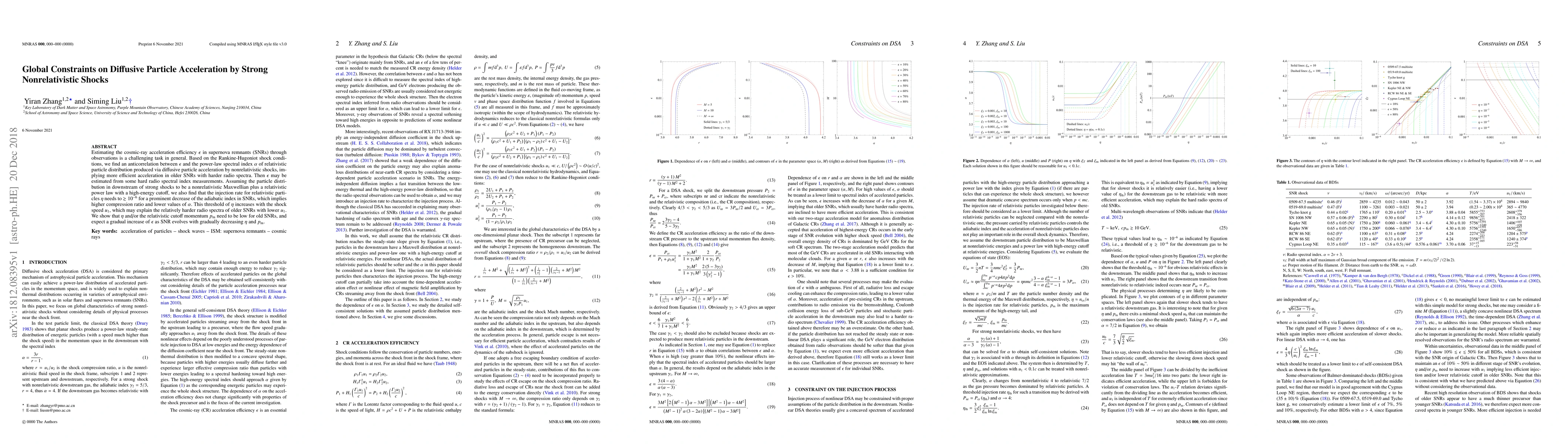 Estimating the cosmic-ray acceleration efficiency $ \epsilon $ in supernova remnants (SNRs) through observations is a challenging task in general. Based on the Rankine-Hugoniot shock conditions, we find an anticorrelation between $ \epsilon $ and the power-law spectral index $ \alpha $ of relativistic particle distribution produced via diffusive particle acceleration by nonrelativistic shocks, implying more efficient acceleration in older SNRs with harder radio spectra. Then $ \epsilon $ may be estimated from some hard radio spectral index measurements. Assuming the particle distribution in downstream of strong shocks to be a nonrelativistic Maxwellian plus a relativistic power law with a high-energy cutoff, we also find that the injection rate for relativistic particles $ \eta $ needs to $ \gtrsim 10^{-6} $ for a prominent decrease of the adiabatic index in SNRs, which implies higher compression ratio and lower values of $ \alpha $. This threshold of $ \eta $ increases with the shock speed $ u_1 $, which may explain the relatively harder radio spectra of older SNRs with lower $ u_1 $. We show that $ \eta $ and/or the relativistic cutoff momentum $ p_\text{m} $ need to be low for old SNRs, and expect a gradual increase of $ \epsilon $ as SNR evolves with gradually decreasing $ \eta $ and $ p_\text{m} $.