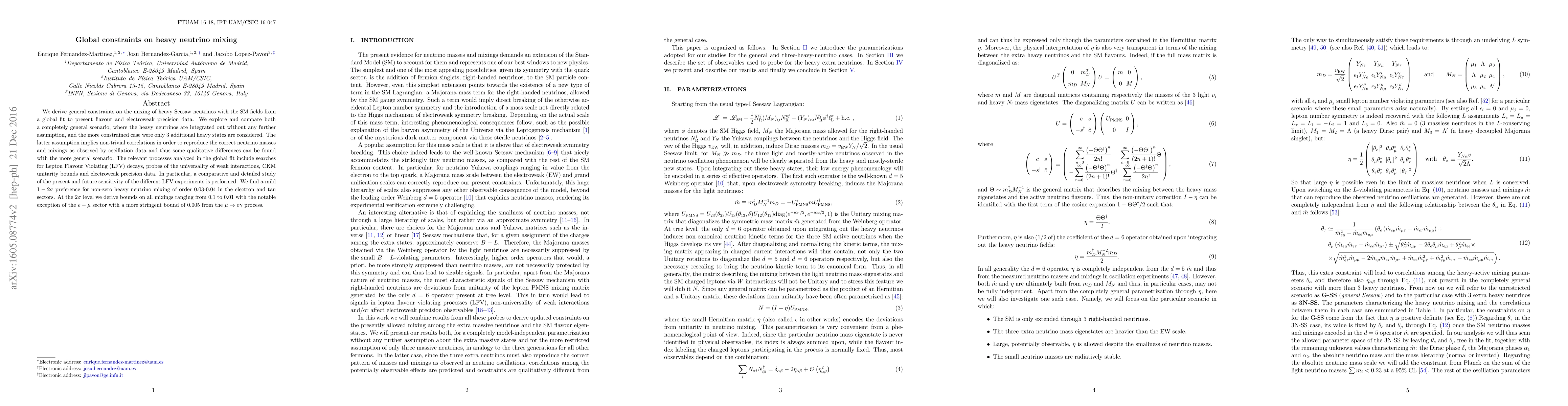 We derive general constraints on the mixing of heavy Seesaw neutrinos with the SM fields from a global fit to present flavour and electroweak precision data. We explore and compare both a completely general scenario, where the heavy neutrinos are integrated out without any further assumption, and the more constrained case were only 3 additional heavy states are considered. The latter assumption implies non-trivial correlations in order to reproduce the correct neutrino masses and mixings as observed by oscillation data and thus some qualitative differences can be found with the more general scenario. The relevant processes analyzed in the global fit include searches for Lepton Flavour Violating (LFV) decays, probes of the universality of weak interactions, CKM unitarity bounds and electroweak precision data. In particular, a comparative and detailed study of the present and future sensitivity of the different LFV experiments is performed. We find a mild $1-2\sigma$ preference for non-zero heavy neutrino mixing of order 0.03-0.04 in the electron and tau sectors. At the $2\sigma$ level we derive bounds on all mixings ranging from 0.1 to 0.01 with the notable exception of the $e-\mu$ sector with a more stringent bound of 0.005 from the $\mu \to e \gamma$ process.
