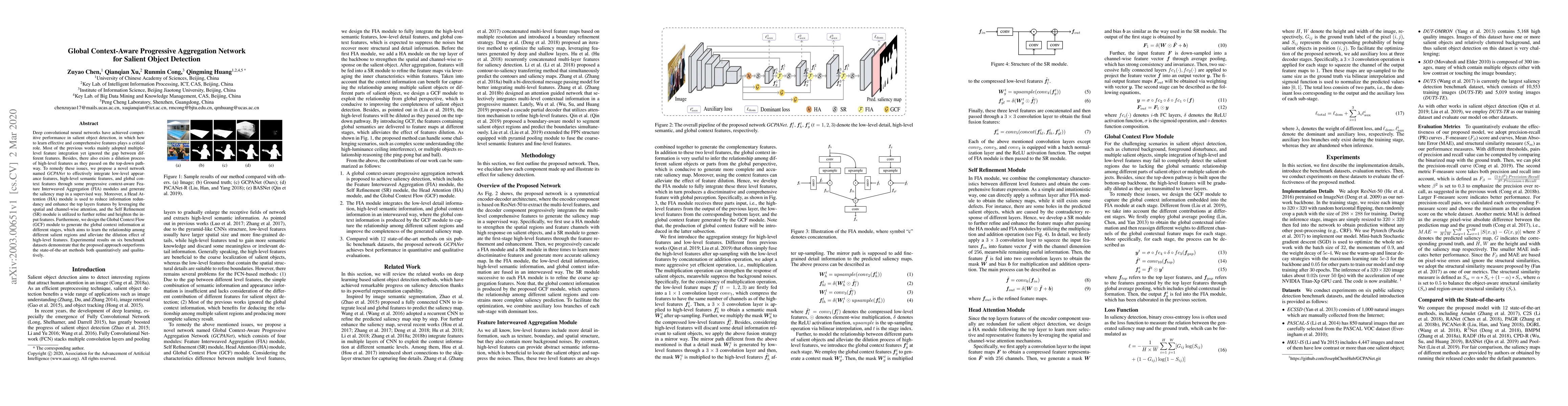 The paper proposes GCPANet, a novel deep convolutional neural network for salient object detection that integrates low-level, high-level, and global context features using progressive context-aware aggregation modules. The network enhances salient feature extraction and reduces information redundancy, achieving superior performance on benchmark datasets.
