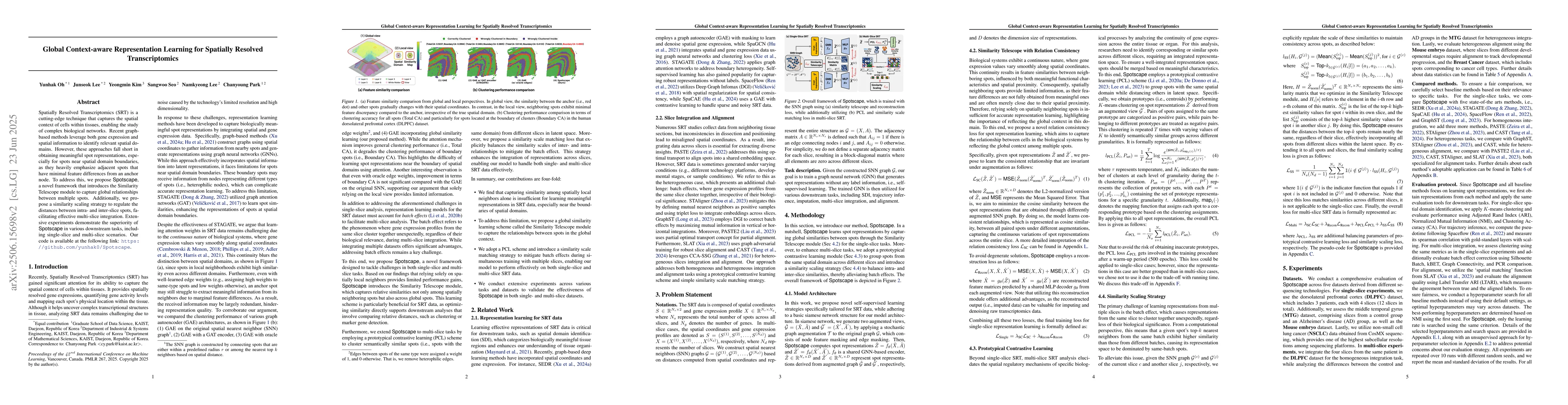 Spatially Resolved Transcriptomics (SRT) is a cutting-edge technique that captures the spatial context of cells within tissues, enabling the study of complex biological networks. Recent graph-based methods leverage both gene expression and spatial information to identify relevant spatial domains. However, these approaches fall short in obtaining meaningful spot representations, especially for spots near spatial domain boundaries, as they heavily emphasize adjacent spots that have minimal feature differences from an anchor node. To address this, we propose Spotscape, a novel framework that introduces the Similarity Telescope module to capture global relationships between multiple spots. Additionally, we propose a similarity scaling strategy to regulate the distances between intra- and inter-slice spots, facilitating effective multi-slice integration. Extensive experiments demonstrate the superiority of Spotscape in various downstream tasks, including single-slice and multi-slice scenarios. Our code is available at the following link: https: //github.com/yunhak0/Spotscape.