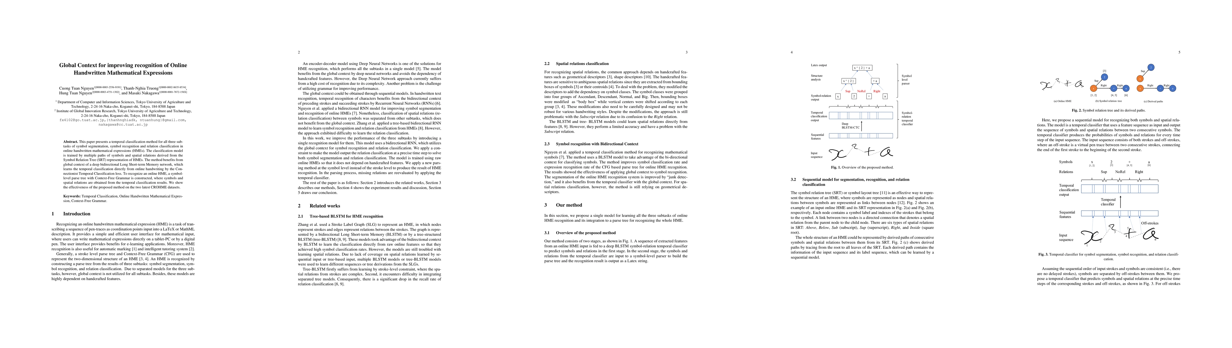 This paper proposes a temporal classification method for recognizing online handwritten mathematical expressions, utilizing a deep bidirectional LSTM network for global context and Connectionist Temporal Classification to improve symbol segmentation, recognition, and relation classification. The method is validated on the latest CROHME datasets.
