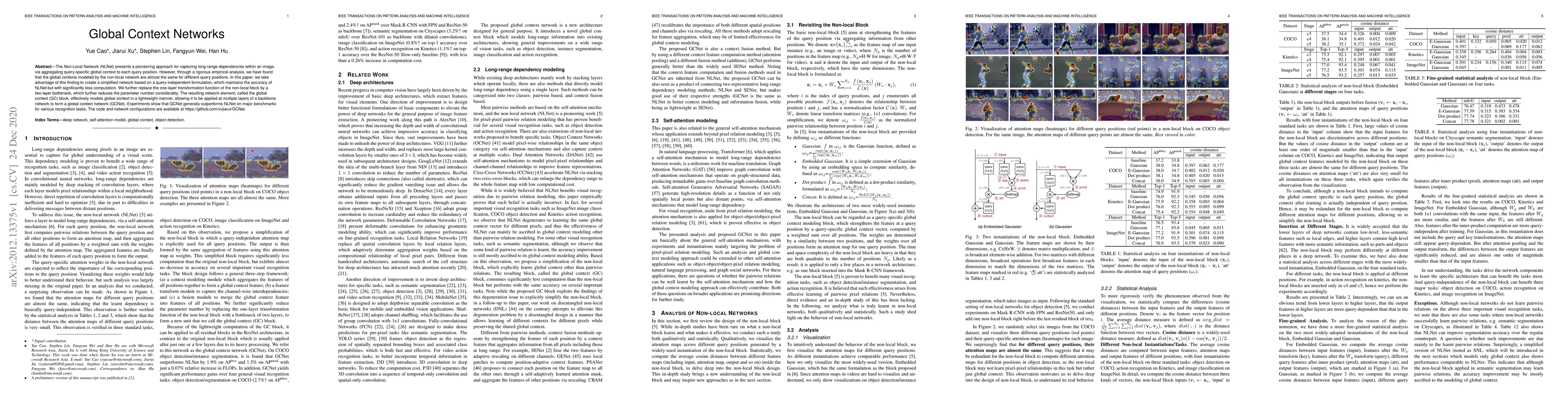 The Non-Local Network (NLNet) presents a pioneering approach for capturing long-range dependencies within an image, via aggregating query-specific global context to each query position. However, through a rigorous empirical analysis, we have found that the global contexts modeled by the non-local network are almost the same for different query positions. In this paper, we take advantage of this finding to create a simplified network based on a query-independent formulation, which maintains the accuracy of NLNet but with significantly less computation. We further replace the one-layer transformation function of the non-local block by a two-layer bottleneck, which further reduces the parameter number considerably. The resulting network element, called the global context (GC) block, effectively models global context in a lightweight manner, allowing it to be applied at multiple layers of a backbone network to form a global context network (GCNet). Experiments show that GCNet generally outperforms NLNet on major benchmarks for various recognition tasks. The code and network configurations are available at https://github.com/xvjiarui/GCNet.