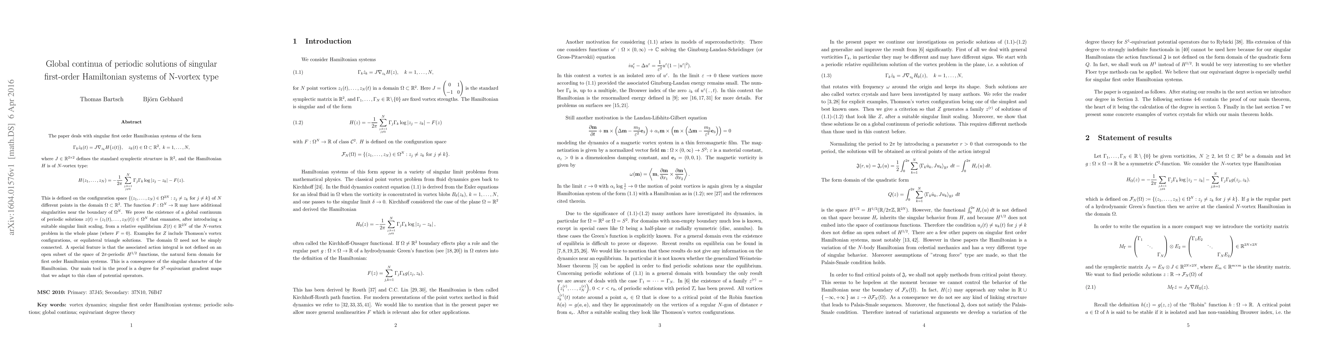 The paper investigates singular first-order Hamiltonian systems of N-vortex type, proving the existence of a global continuum of periodic solutions emanating from relative equilibria like Thomson's configurations. The key challenge is handling the Hamiltonian's singularities and extending the analysis beyond simply connected domains.