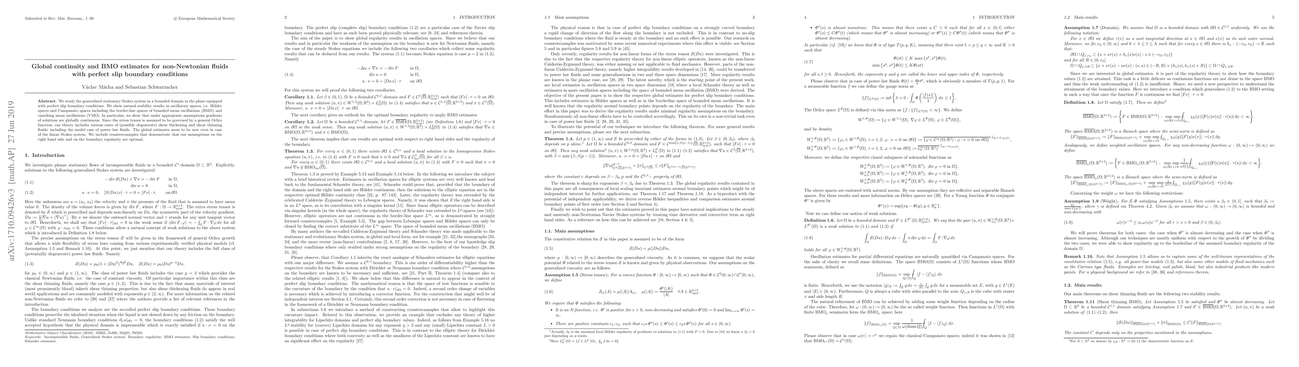 This paper investigates the generalized stationary Stokes system for non-Newtonian fluids under perfect slip boundary conditions, proving global continuity of gradients and BMO estimates. The study covers a range of shear behaviors, including shear thickening and thinning, and introduces novel global estimates even for the linear Stokes system.