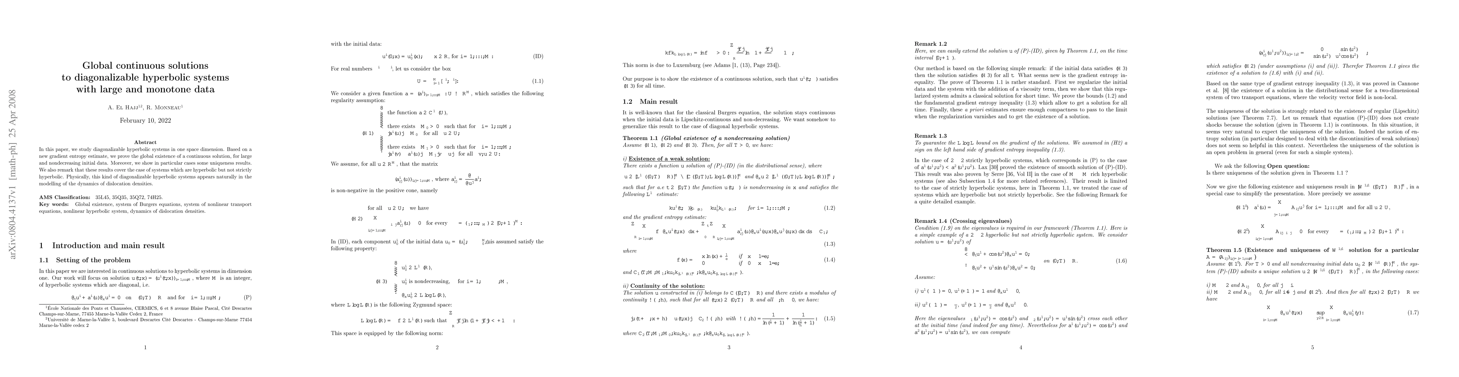 This paper proves global continuous solutions for diagonalizable hyperbolic systems in one space dimension, using a new gradient entropy estimate for large and nondecreasing initial data. It also highlights uniqueness results in specific cases and covers systems that are hyperbolic but not strictly hyperbolic, relevant to modeling dislocation densities.