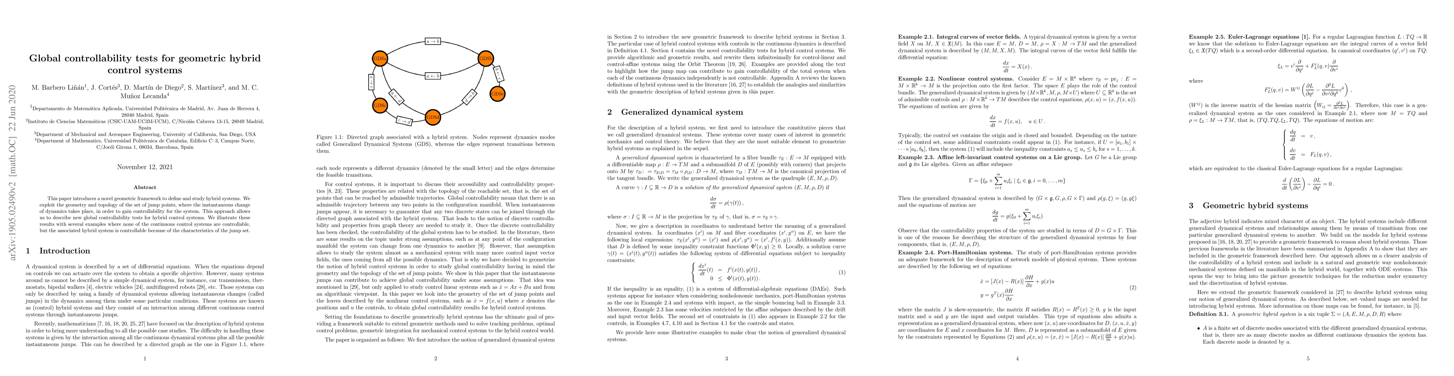 This paper introduces a geometric framework for hybrid control systems, enabling the addition of controls. It presents new global controllability tests, leveraging the geometry and topology of jump points, where dynamic changes occur. The method demonstrates controllability examples unattainable by continuous control systems alone, due to the unique properties of the jump set.
