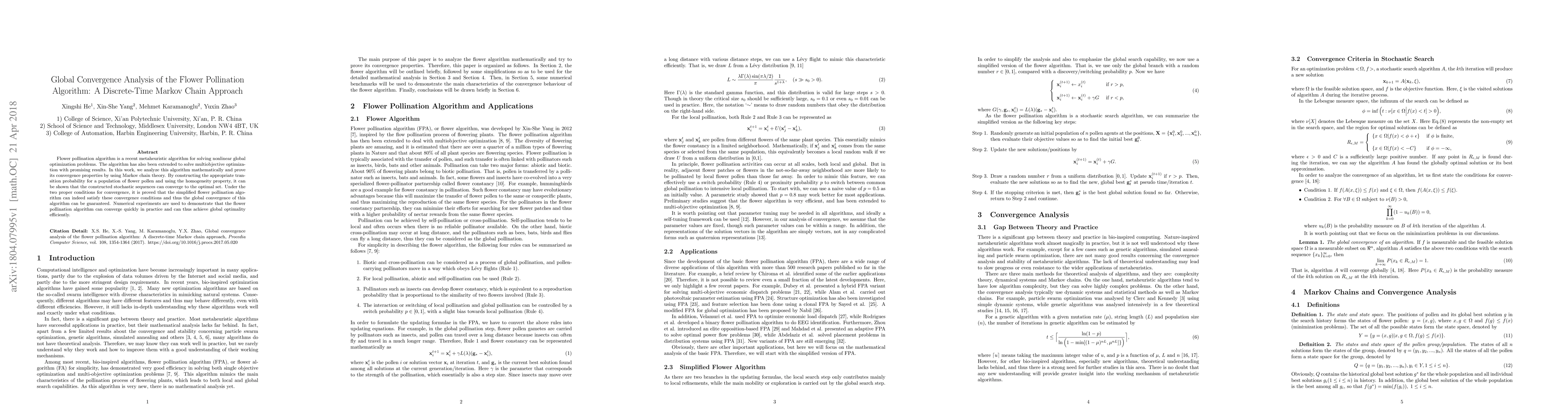 This paper mathematically analyzes the flower pollination algorithm using Markov chain theory to prove its global convergence properties. Under specific conditions, it demonstrates that the algorithm can efficiently achieve global optimality, supported by numerical experiments.
