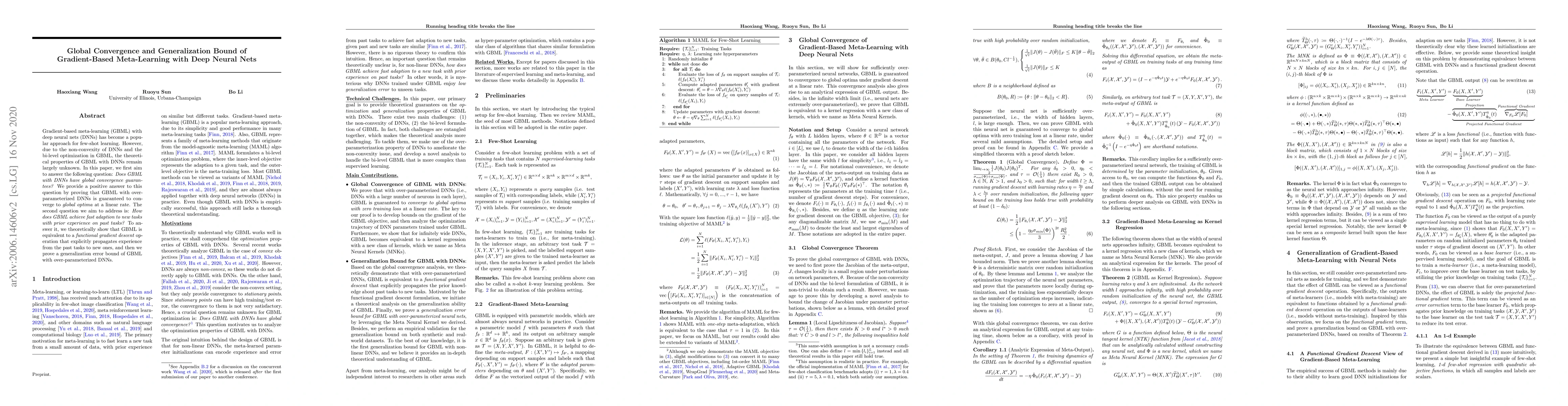 This paper investigates the global convergence and generalization properties of gradient-based meta-learning with deep neural networks. It proves that over-parameterized DNNs in GBML converge to global optima linearly and provides a generalization error bound, demonstrating how GBML effectively leverages past experience for rapid adaptation to new tasks.