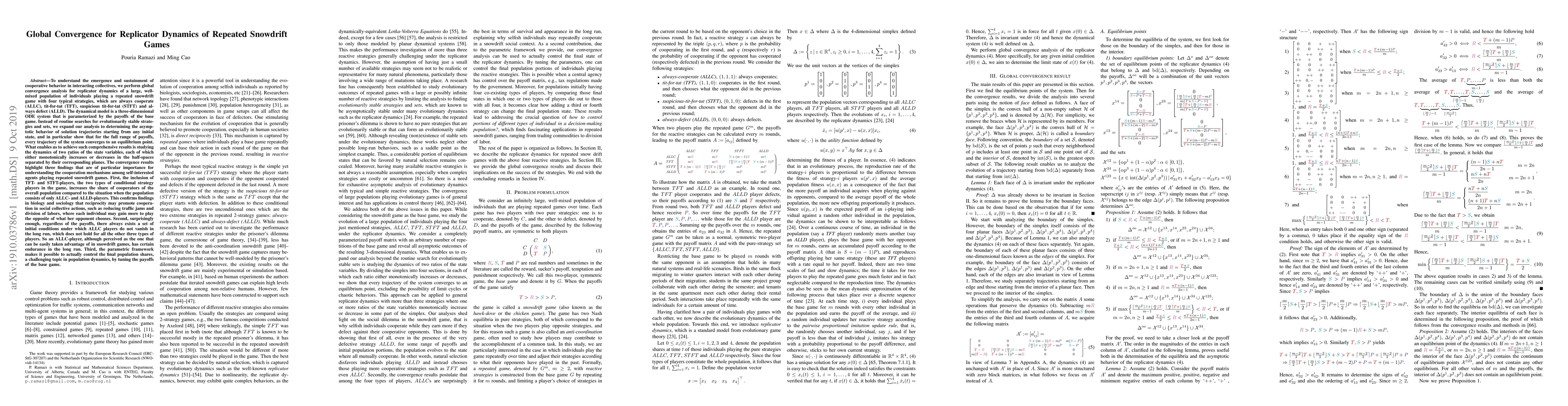 To understand the emergence and sustainment of cooperative behavior in interacting collectives, we perform global convergence analysis for replicator dynamics of a large, well-mixed population of individuals playing a repeated snowdrift game with four typical strategies, which are always cooperate (ALLC), tit-for-tat (TFT), suspicious tit-for-tat (STFT) and always defect (ALLD). The dynamical model is a three-dimensional ODE system that is parameterized by the payoffs of the base game. Instead of routine searches for evolutionarily stable strategies and sets, we expand our analysis to determining the asymptotic behavior of solution trajectories starting from any initial state, and in particular show that for the full range of payoffs, every trajectory of the system converges to an equilibrium point. The convergence results highlight three findings that are of particular importance for understanding the cooperation mechanisms among self-interested agents playing repeated snowdrift games. First, the inclusion of TFT- and STFT-players, the two types of conditional strategy players in the game, increases the share of cooperators of the overall population compared to the situation when the population consists of only ALLC- and ALLD-players. This confirms findings in biology and sociology that reciprocity may promote cooperation in social collective actions, such as reducing traffic jams and division of labor, where each individual may gain more to play the opposite of what her opponent chooses. Second, surprisingly enough, regardless of the payoffs, there always exists a set of initial conditions under which ALLC players do not vanish in the long run, which does not hold for all the other three types of players. So an ALLC-player, although perceived as the one that can be easily taken advantage of in snowdrift games, has certain endurance in the long run.