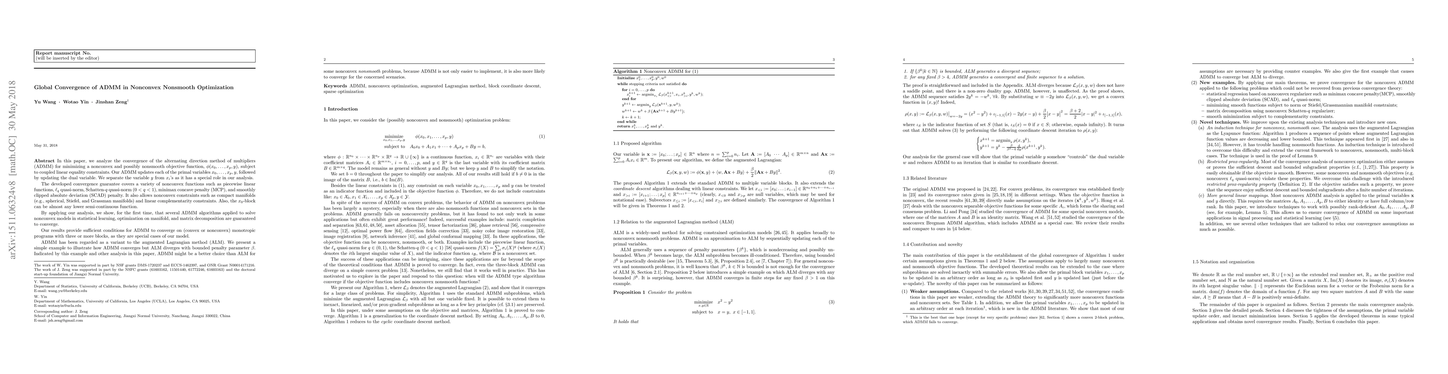 of multipliers (ADMM) for minimizing a nonconvex and possibly nonsmooth