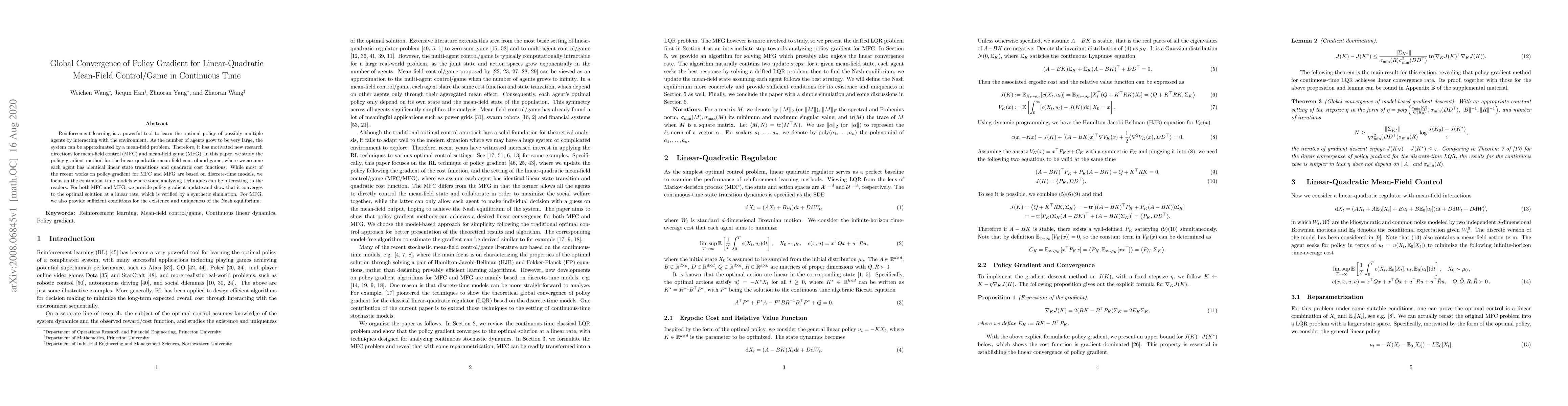 This paper explores the policy gradient method for linear-quadratic mean-field control and game in continuous time, demonstrating convergence to the optimal solution at a linear rate and providing conditions for Nash equilibrium existence and uniqueness in mean-field games.
