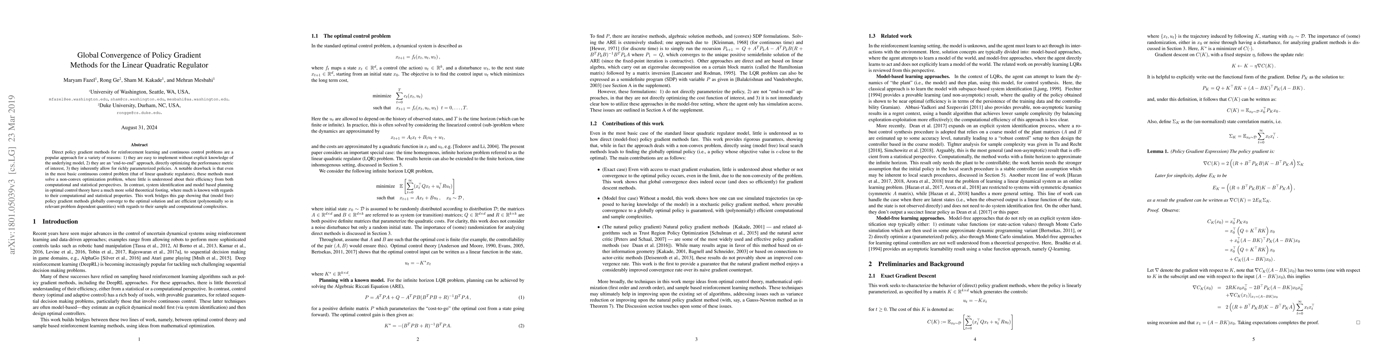 This paper demonstrates that model-free policy gradient methods globally converge to the optimal solution for linear quadratic regulator problems, providing polynomial efficiency in terms of sample and computational complexities. It bridges the theoretical gap between direct policy gradient methods and traditional model-based optimal control approaches.
