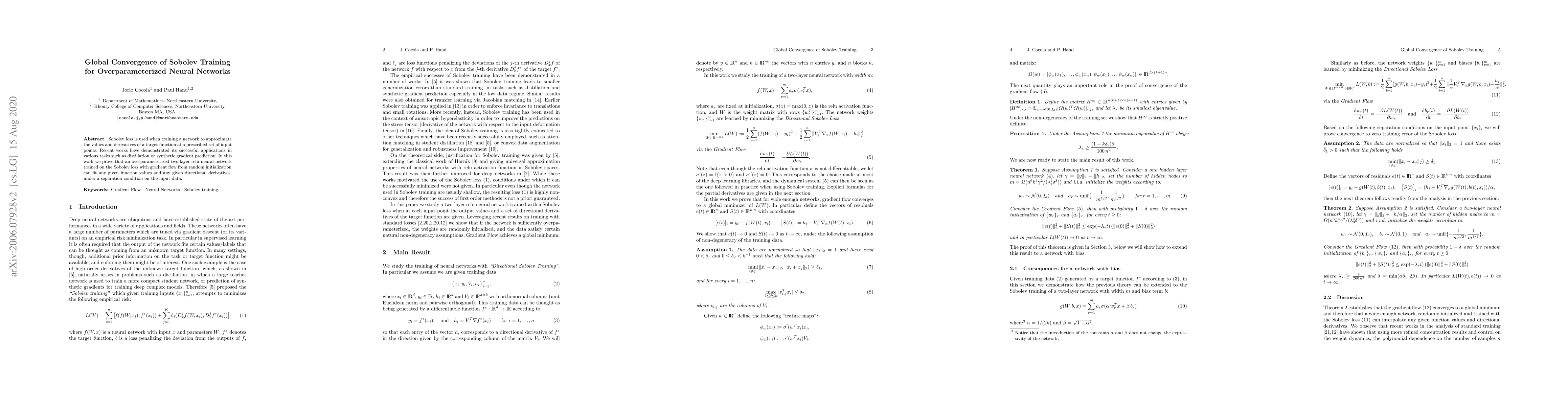 Sobolev loss is used when training a network to approximate the values and derivatives of a target function at a prescribed set of input points. Recent works have demonstrated its successful applications in various tasks such as distillation or synthetic gradient prediction. In this work we prove that an overparameterized two-layer relu neural network trained on the Sobolev loss with gradient flow from random initialization can fit any given function values and any given directional derivatives, under a separation condition on the input data.