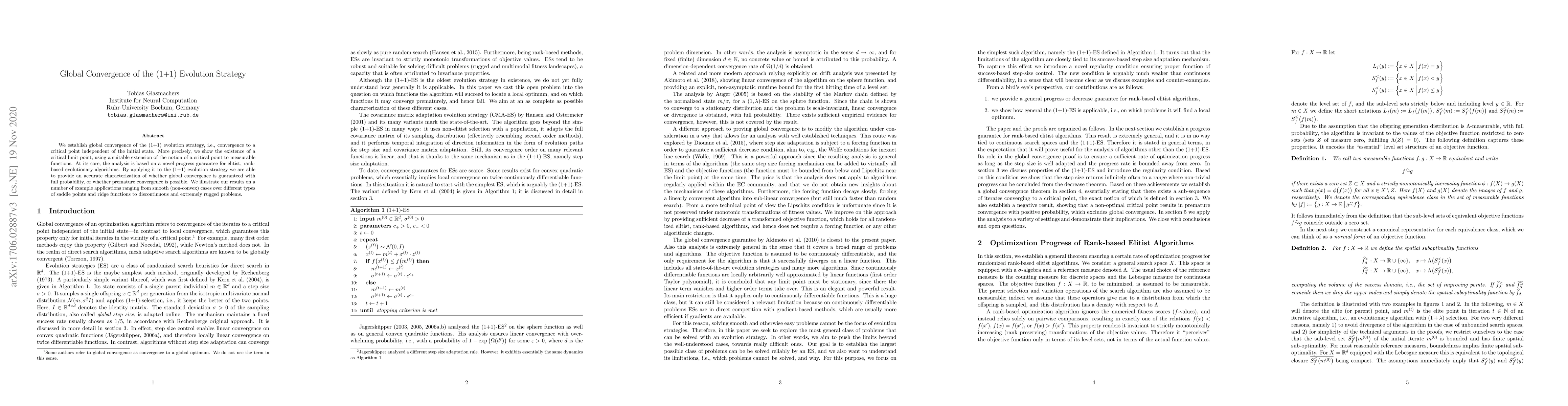 The (1+1) evolution strategy has been proven to converge globally, meaning it will reach a critical point regardless of its starting position, with the help of a novel progress guarantee for elitist evolutionary algorithms.