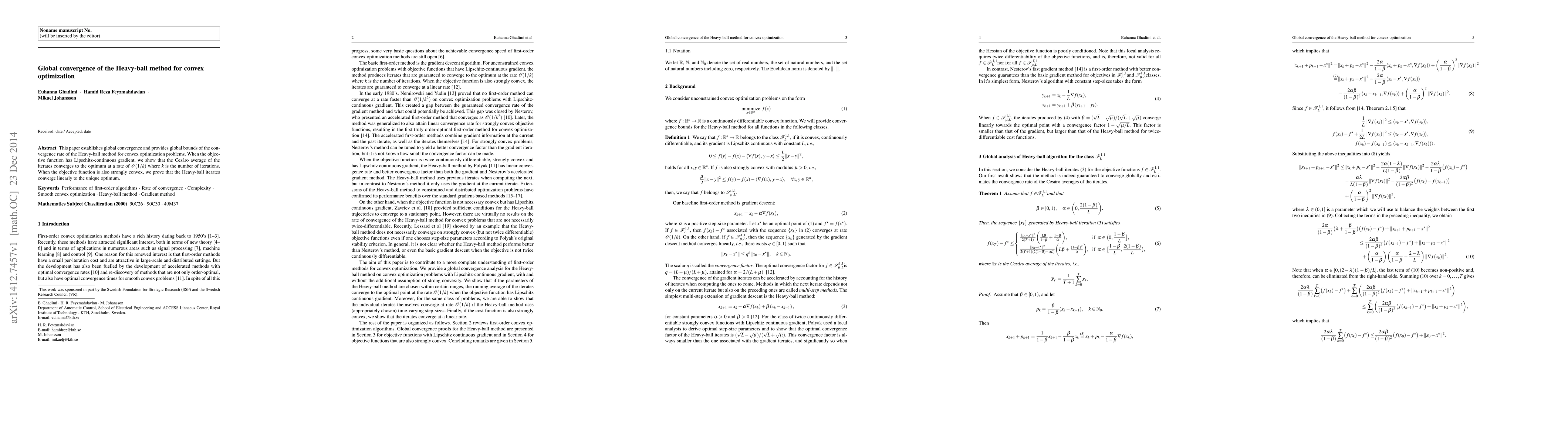 This paper proves global convergence and convergence rate bounds for the Heavy-ball method in convex optimization. It establishes an $O(1/k)$ convergence rate for Lipschitz-continuous gradient functions and linear convergence for strongly convex objective functions.