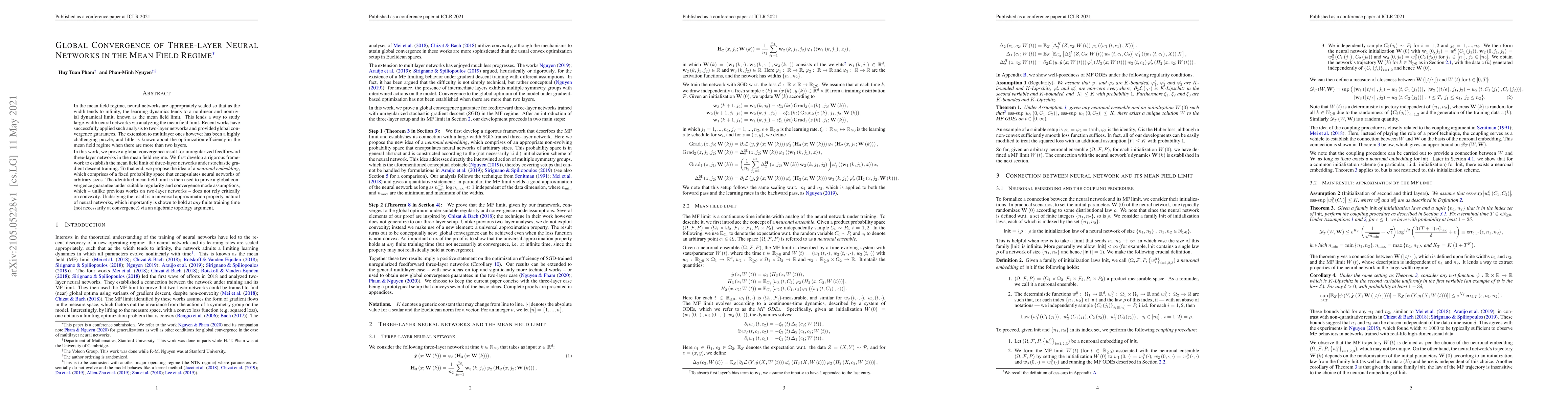 This paper proves global convergence for unregularized three-layer neural networks in the mean field regime, establishing a rigorous framework to analyze the mean field limit under stochastic gradient descent. It introduces a "neuronal embedding" concept and leverages an algebraic topology argument to demonstrate a universal approximation property at any finite training time.