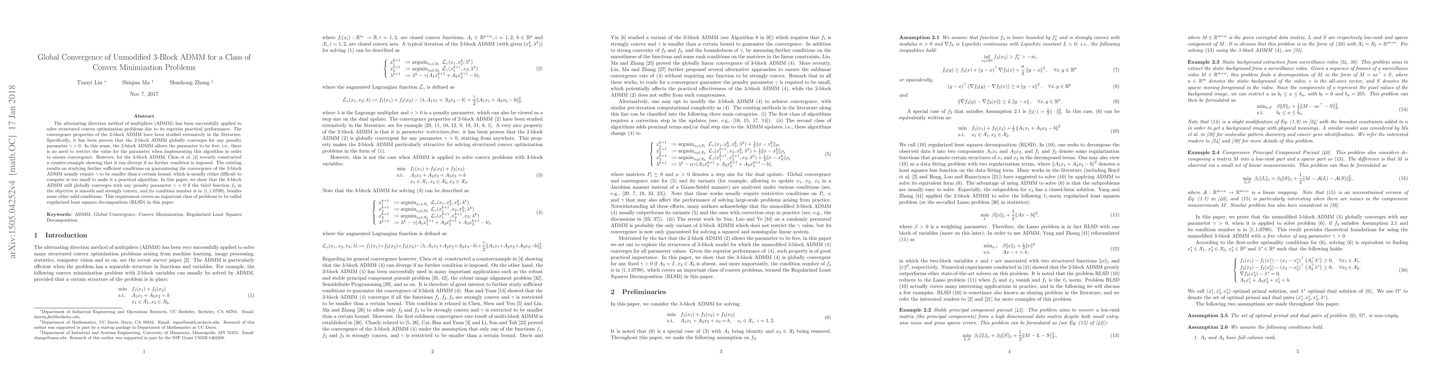 The alternating direction method of multipliers (ADMM) has been successfully applied to solve structured convex optimization problems due to its superior practical performance. The convergence properties of the 2-block ADMM have been studied extensively in the literature. Specifically, it has been proven that the 2-block ADMM globally converges for any penalty parameter $\gamma>0$. In this sense, the 2-block ADMM allows the parameter to be free, i.e., there is no need to restrict the value for the parameter when implementing this algorithm in order to ensure convergence. However, for the 3-block ADMM, Chen \etal \cite{Chen-admm-failure-2013} recently constructed a counter-example showing that it can diverge if no further condition is imposed. The existing results on studying further sufficient conditions on guaranteeing the convergence of the 3-block ADMM usually require $\gamma$ to be smaller than a certain bound, which is usually either difficult to compute or too small to make it a practical algorithm. In this paper, we show that the 3-block ADMM still globally converges with any penalty parameter $\gamma>0$ if the third function $f_3$ in the objective is smooth and strongly convex, and its condition number is in $[1,1.0798)$, besides some other mild conditions. This requirement covers an important class of problems to be called regularized least squares decomposition (RLSD) in this paper.
