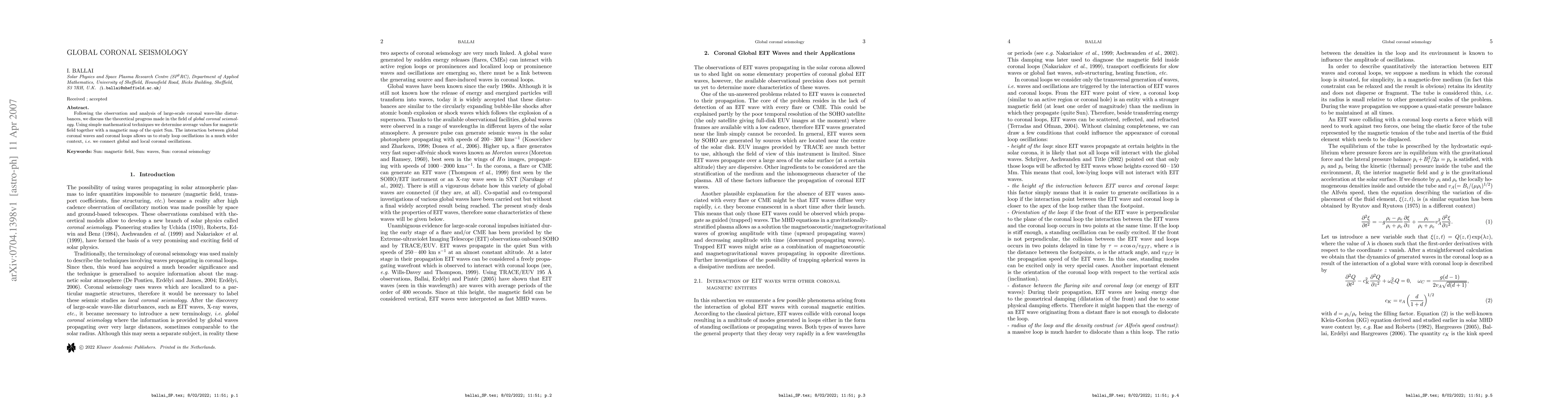 This paper discusses advancements in global coronal seismology, focusing on large-scale coronal wave-like disturbances. It employs mathematical techniques to derive average magnetic field values and a magnetic map of the quiet Sun, linking global coronal waves to loop oscillations for a broader understanding of coronal dynamics.