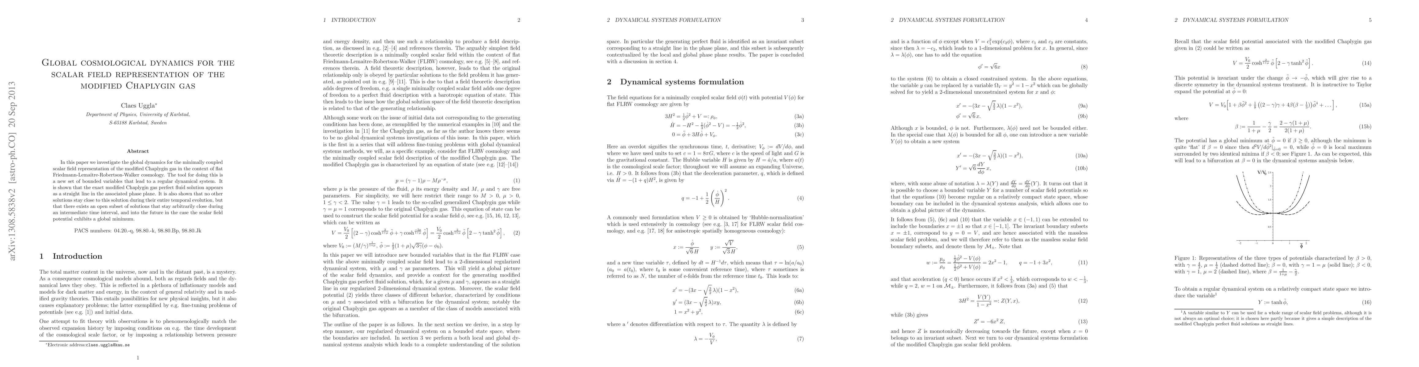 In this paper we investigate the global dynamics for the minimally coupled scalar field representation of the modified Chaplygin gas in the context of flat FLRW cosmology. The tool for doing this is a new set of bounded variables that lead to a regular dynamical system. It is shown that the exact modified Chaplygin gas perfect fluid solution appears as a straight line in the associated phase plane. It is also shown that no other solutions stay close to this solution during their entire temporal evolution, but that there exists an open subset of solutions that stay arbitrarily close during an intermediate time interval, and into the future in the case the scalar field potential exhibits a global minimum.