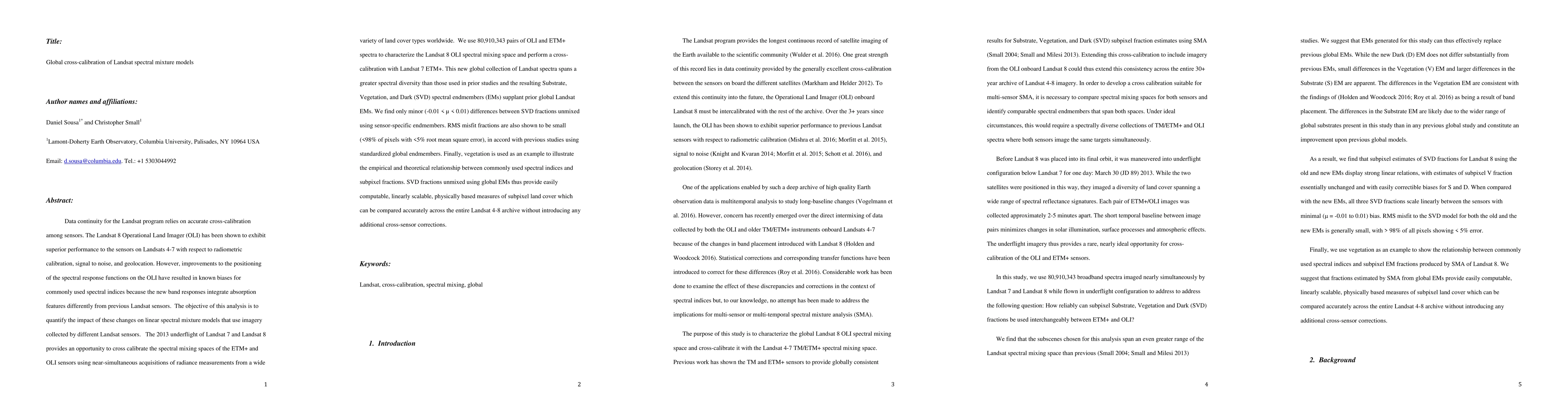 Data continuity for the Landsat program relies on accurate cross-calibration among sensors. The Landsat 8 OLI has been shown to exhibit superior performance to the sensors on Landsats 4-7 with respect to radiometric calibration, signal to noise, and geolocation. However, improvements to the positioning of the spectral response functions on the OLI have resulted in known biases for commonly used spectral indices because the new band responses integrate absorption features differently from previous Landsat sensors. The objective of this analysis is to quantify the impact of these changes on linear spectral mixture models that use imagery collected by different Landsat sensors. The 2013 underflight of Landsat 7 and 8 provides an opportunity to cross calibrate the spectral mixing spaces of the ETM+ and OLI sensors using near-simultaneous acquisitions from a wide variety of land cover types worldwide. We use 80,910,343 pairs of OLI and ETM+ spectra to characterize the OLI spectral mixing space and perform a cross-calibration with ETM+. This new global collection of Landsat spectra spans a greater spectral diversity than those used in prior studies and the resulting Substrate, Vegetation, and Dark (SVD) spectral endmembers (EMs) supplant prior global Landsat EMs. We find only minor (-0.01 < u < 0.01) differences between SVD fractions unmixed using sensor-specific EMs. RMS misfit fractions are also small (<98% of pixels with <5% RMSE), in accord with past studies. Finally, vegetation is used as an example to illustrate the empirical and theoretical relationship between commonly used spectral indices and subpixel fractions. SVD fractions unmixed using global EMs thus provide easily computable, linearly scalable, physically based measures of subpixel land cover which can be compared accurately across the entire Landsat 4-8 archive without introducing any additional cross-sensor corrections.