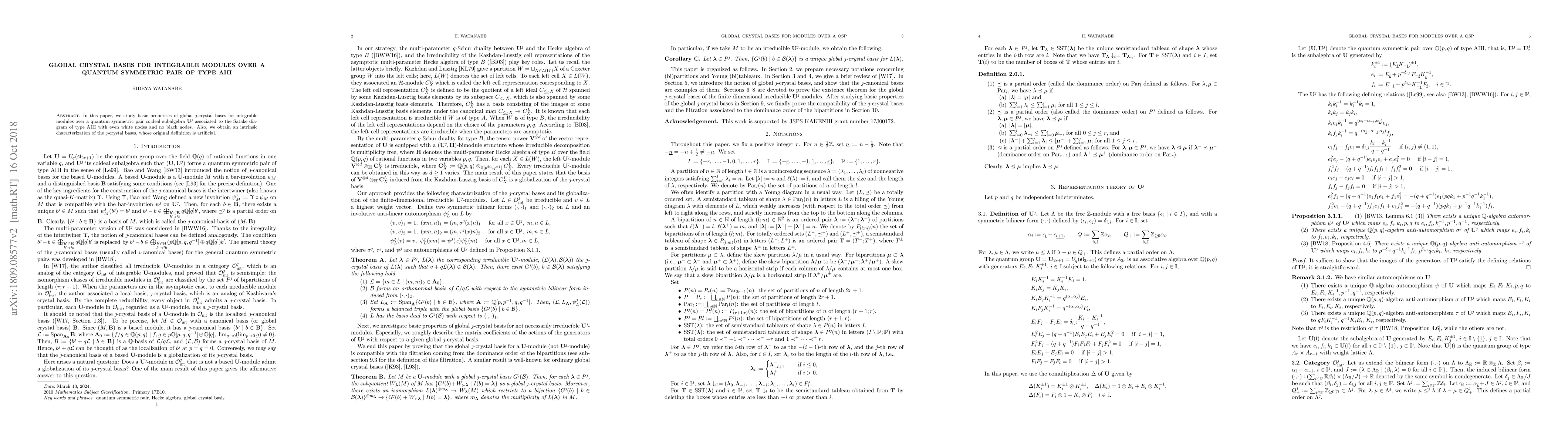 In this paper, we study basic properties of global $\jmath$-crystal bases for integrable modules over a quantum symmetric pair coideal subalgebra $\mathbf{U}^{\jmath}$ associated to the Satake diagram of type AIII with even white nodes and no black nodes. Also, we obtain an intrinsic characterization of the $\jmath$-crystal bases, whose original definition is artificial.