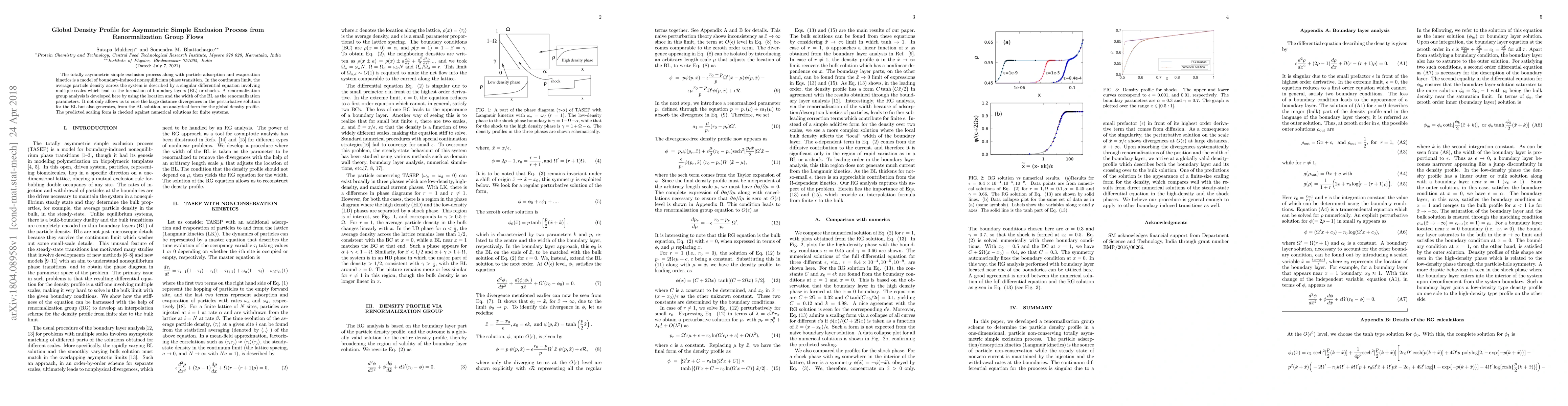 The totally asymmetric simple exclusion process along with particle adsorption and evaporation kinetics is a model of boundary-induced nonequilibrium phase transition. In the continuum limit, the average particle density across the system is described by a singular differential equation involving multiple scales which lead to the formation of boundary layers (BL) or shocks. A renormalization group analysis is developed here by using the location and the width of the BL as the renormalization parameters. It not only allows us to cure the large distance divergences in the perturbative solution for the BL but also generates, from the BL solution, an analytical form for the global density profile. The predicted scaling form is checked against numerical solutions for finite systems.