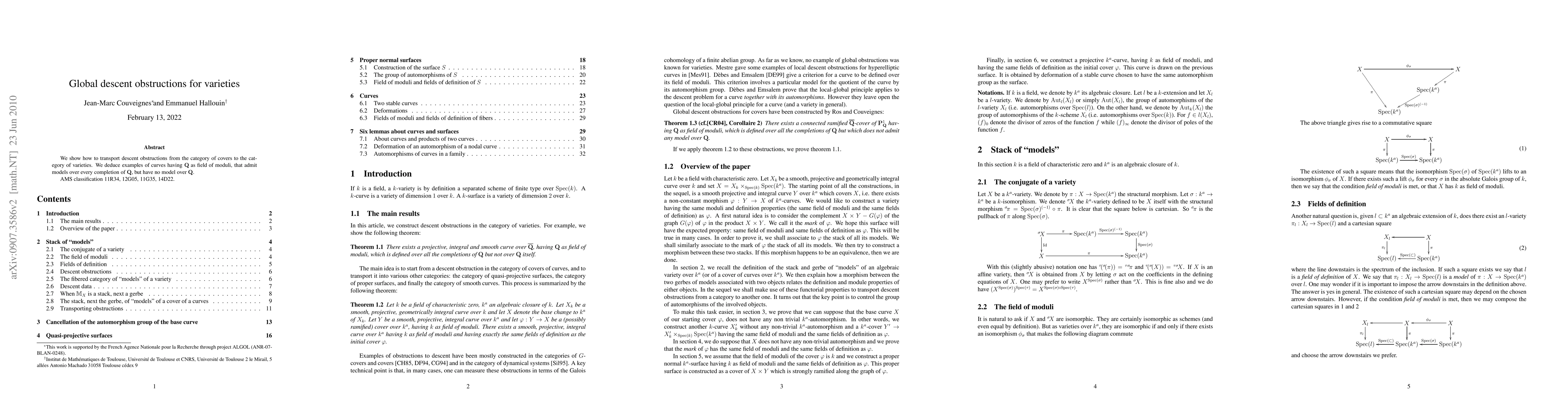 This paper demonstrates a method for transferring descent obstructions from covers to varieties, illustrating this with curves that have $\mathbb{Q}$ as their field of moduli but lack a model over $\mathbb{Q}$ despite admitting models over every completion of $\mathbb{Q}$.