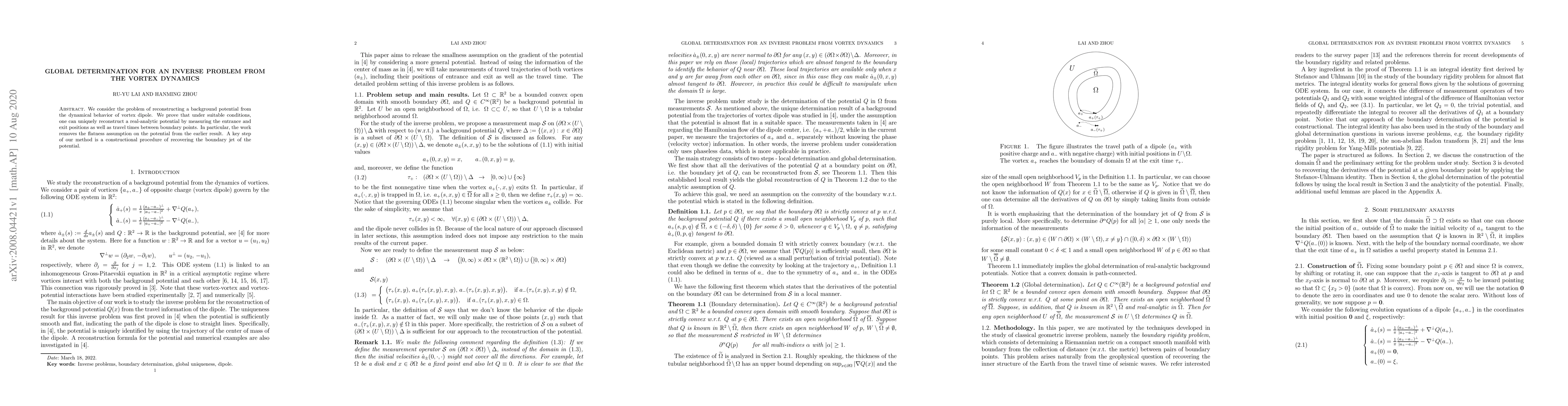We consider the problem of reconstructing a background potential from the dynamical behavior of vortex dipole. We prove that under suitable conditions, one can uniquely reconstruct a real-analytic potential by measuring the entrance and exit positions as well as travel times between boundary points. In particular, the work removes the flatness assumption on the potential from the earlier result. A key step of our method is a constructional procedure of recovering the boundary jet of the potential.