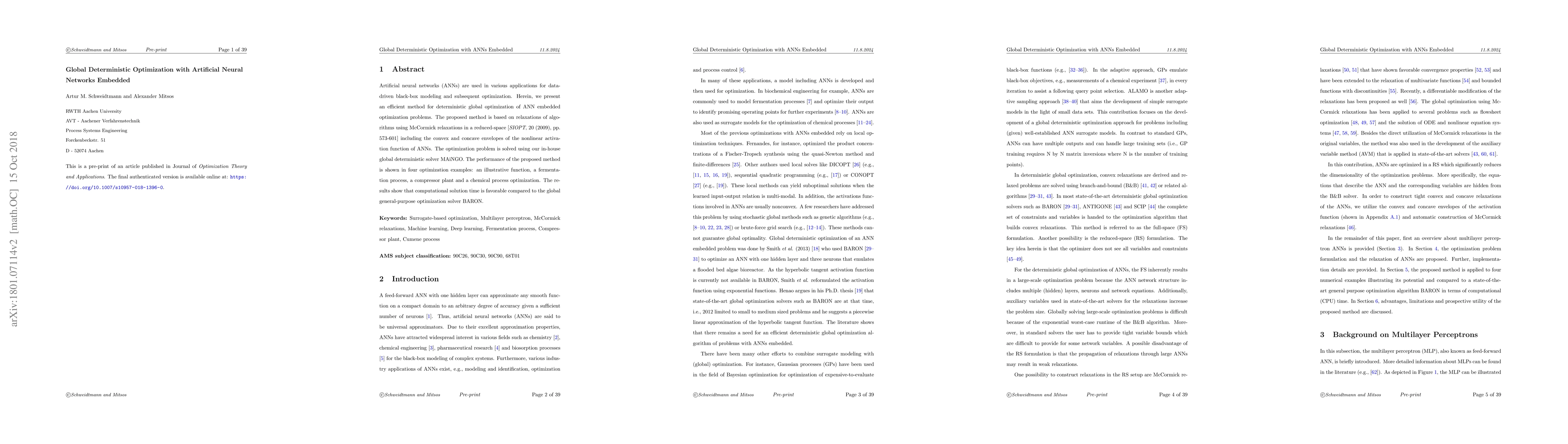 This paper proposes an efficient deterministic global optimization method for artificial neural networks (ANNs) using McCormick relaxations and the MAiNGO solver. The method demonstrates favorable computational performance compared to the global solver BARON in various optimization examples.