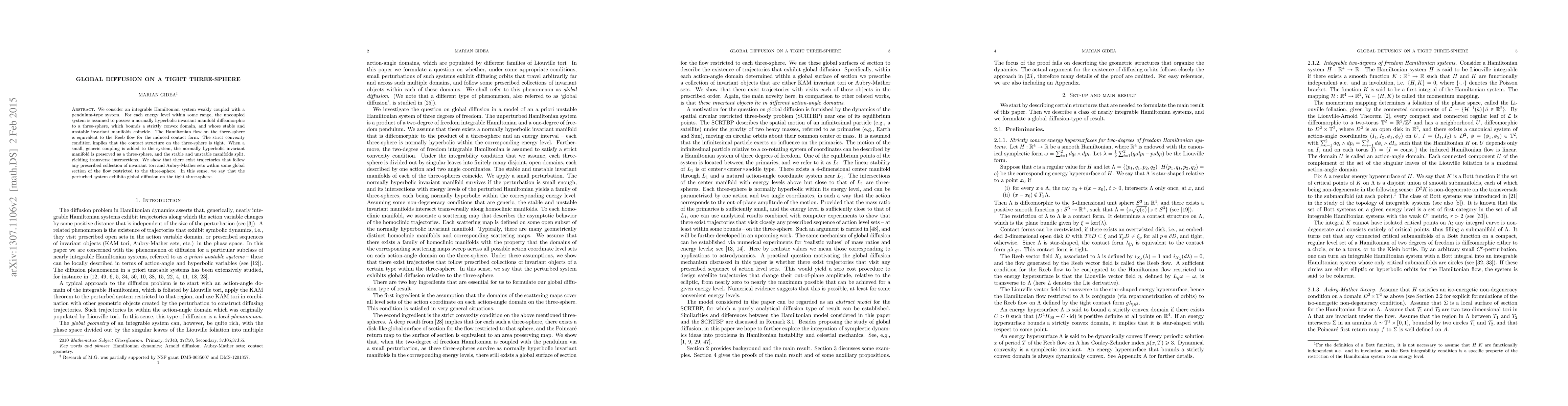 A system with a normally hyperbolic invariant manifold on a three-sphere can exhibit global diffusion when a small coupling is added, allowing it to follow any prescribed collection of invariant tori and Aubry-Mather sets.
