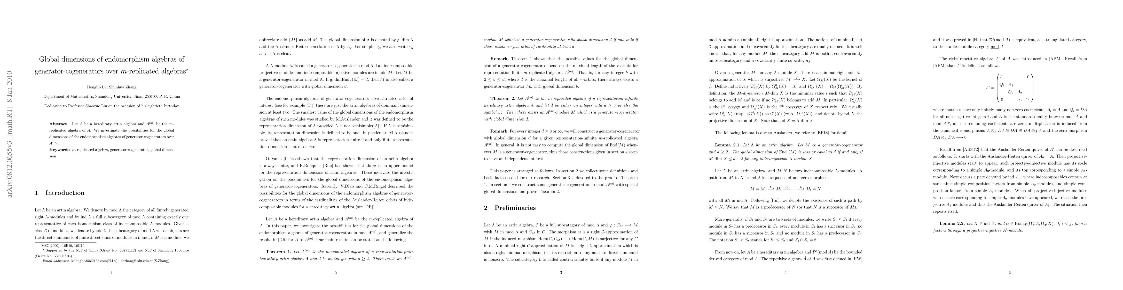 Let $A$ be a hereditary artin algebra and $A^{(m)}$ be the $m$-replicated algebra of $A$. We investigate the possibilities for the global dimensions of the endomorphism algebras of generator-cogenerators over $A^{(m)}$.