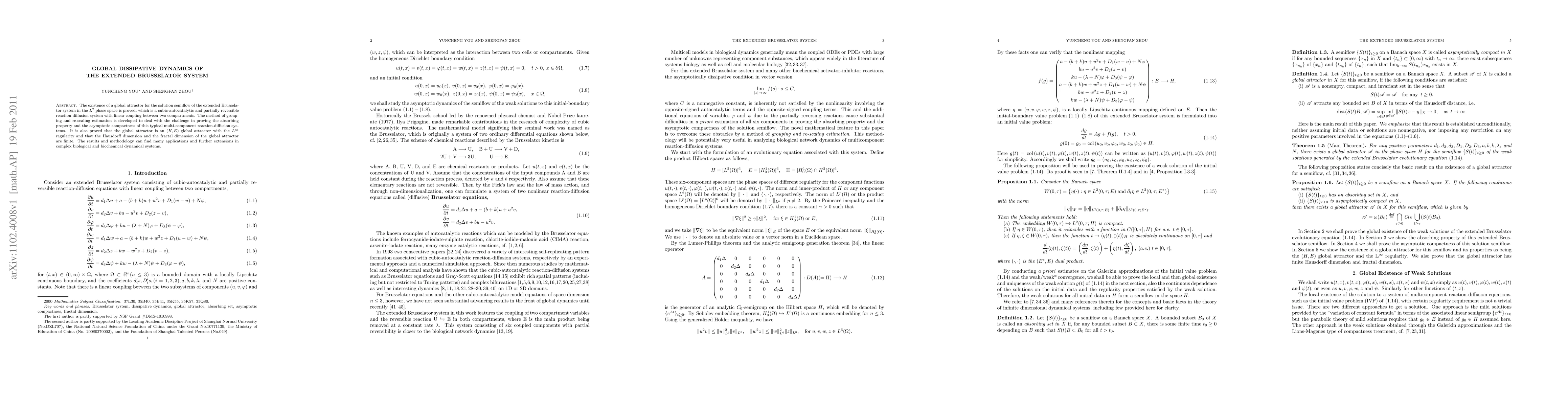 The existence of a global attractor for the solution semiflow of the extended Brusselator system in the $L^2$ phase space is proved, which is a cubic-autocatalytic and partially reversible reaction-diffusion system with linear coupling between two compartments. The method of grouping and re-scaling estimation is developed to deal with the challenge in proving the absorbing property and the asymptotic compactness of this typical multi-component reaction-diffusion systems. It is also proved that the global attractor is an $(H, E)$ global attractor with the $L^\infty$ regularity and that the Hausdorff dimension and the fractal dimension of the global attractor are finite. The results and methodology can find many applications and further extensions in complex biological and biochemical dynamical systems.