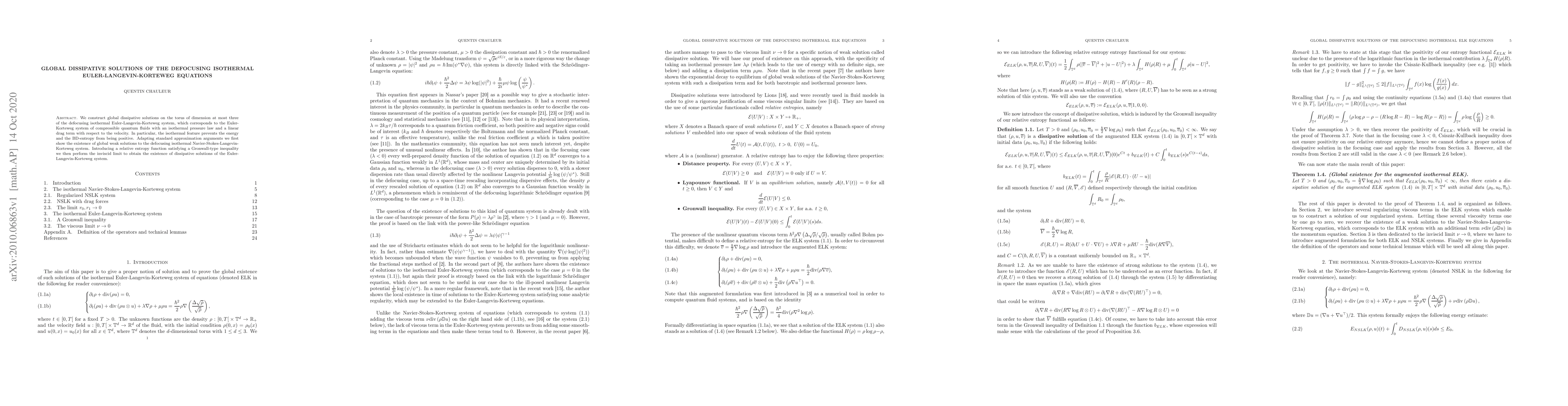 We construct global dissipative solutions on the torus of dimension at most three of the defocusing isothermal Euler-Langevin-Korteweg system, which corresponds to the Euler-Korteweg system of compressible quantum fluids with an isothermal pressure law and a linear drag term with respect to the velocity. In particular, the isothermal feature prevents the energy and the BD-entropy from being positive. Adapting standard approximation arguments we first show the existence of global weak solutions to the defocusing isothermal Navier-Stokes-Langevin-Korteweg system. Introducing a relative entropy function satisfying a Gronwall-type inequality we then perform the inviscid limit to obtain the existence of dissipative solutions of the Euler-Langevin-Korteweg system.