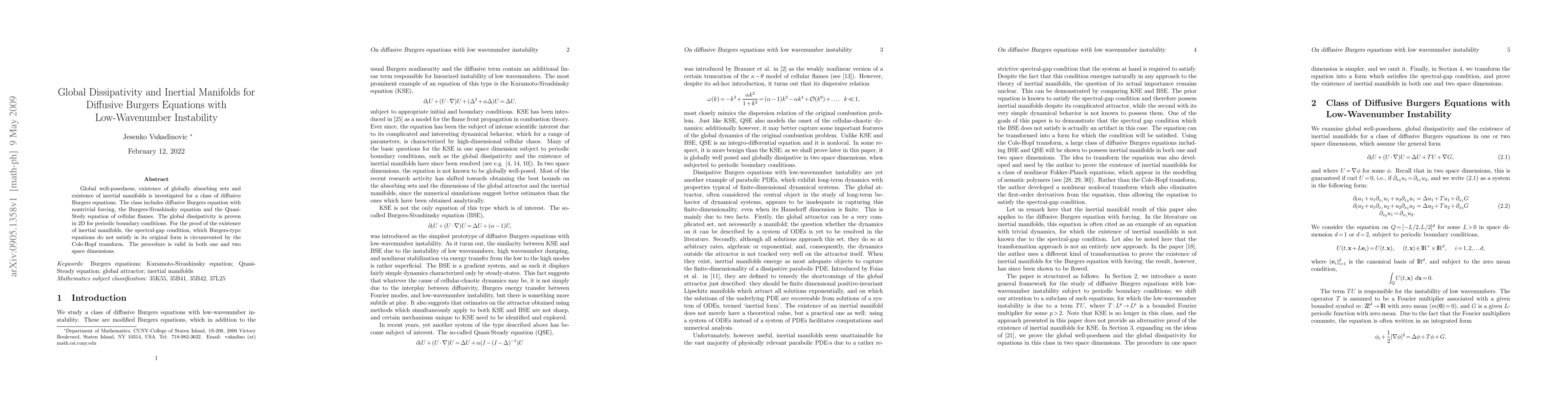 Global well-posedness, existence of globally absorbing sets and existence of inertial manifolds is investigated for a class of diffusive Burgers equations. The class includes diffusive Burgers equation with nontrivial forcing, the Burgers-Sivashinsky equation and the Quasi-Stedy equation of cellular flames. The global dissipativity is proven in 2D for periodic boundary conditions. For the proof of the existence of inertial manifolds, the spectral-gap condition, which Burgers-type equations do not satisfy in its original form is circumvented by the Cole-Hopf transform. The procedure is valid in both one and two space dimensions.