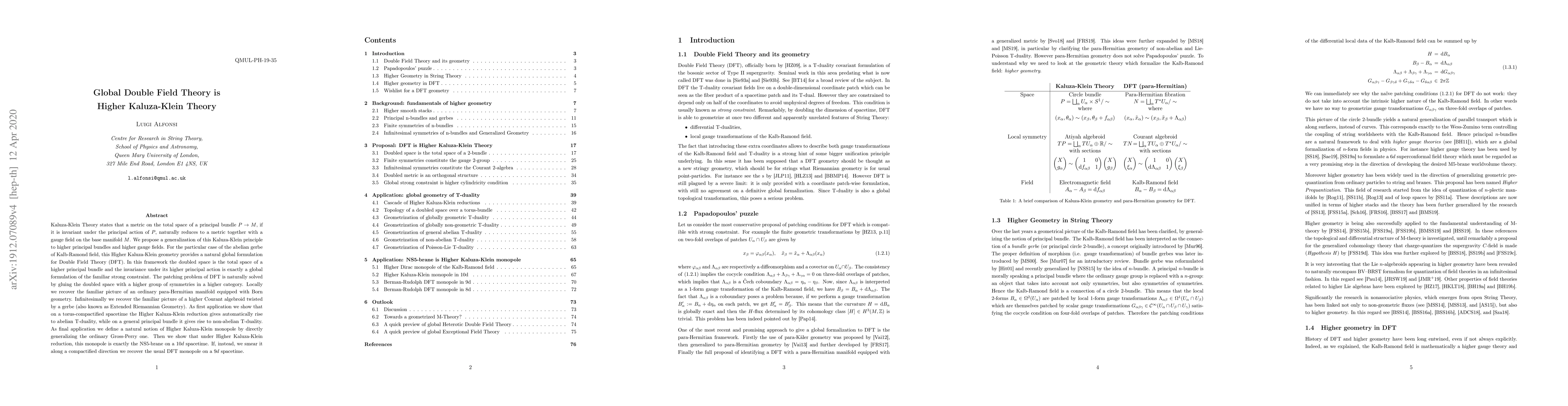 Kaluza-Klein Theory states that a metric on the total space of a principal bundle $P\rightarrow M$, if it is invariant under the principal action of $P$, naturally reduces to a metric together with a gauge field on the base manifold $M$. We propose a generalization of this Kaluza-Klein principle to higher principal bundles and higher gauge fields. For the particular case of the abelian gerbe of Kalb-Ramond field, this Higher Kaluza-Klein geometry provides a natural global formulation for Double Field Theory (DFT). In this framework the doubled space is the total space of a higher principal bundle and the invariance under its higher principal action is exactly a global formulation of the familiar strong constraint. The patching problem of DFT is naturally solved by gluing the doubled space with a higher group of symmetries in a higher category. Locally we recover the familiar picture of an ordinary para-Hermitian manifold equipped with Born geometry. Infinitesimally we recover the familiar picture of a higher Courant algebroid twisted by a gerbe (also known as Extended Riemannian Geometry). As first application we show that on a torus-compactified spacetime the Higher Kaluza-Klein reduction gives automatically rise to abelian T-duality, while on a general principal bundle it gives rise to non-abelian T-duality. As final application we define a natural notion of Higher Kaluza-Klein monopole by directly generalizing the ordinary Gross-Perry one. Then we show that under Higher Kaluza-Klein reduction, this monopole is exactly the NS5-brane on a $10d$ spacetime. If, instead, we smear it along a compactified direction we recover the usual DFT monopole on a $9d$ spacetime.