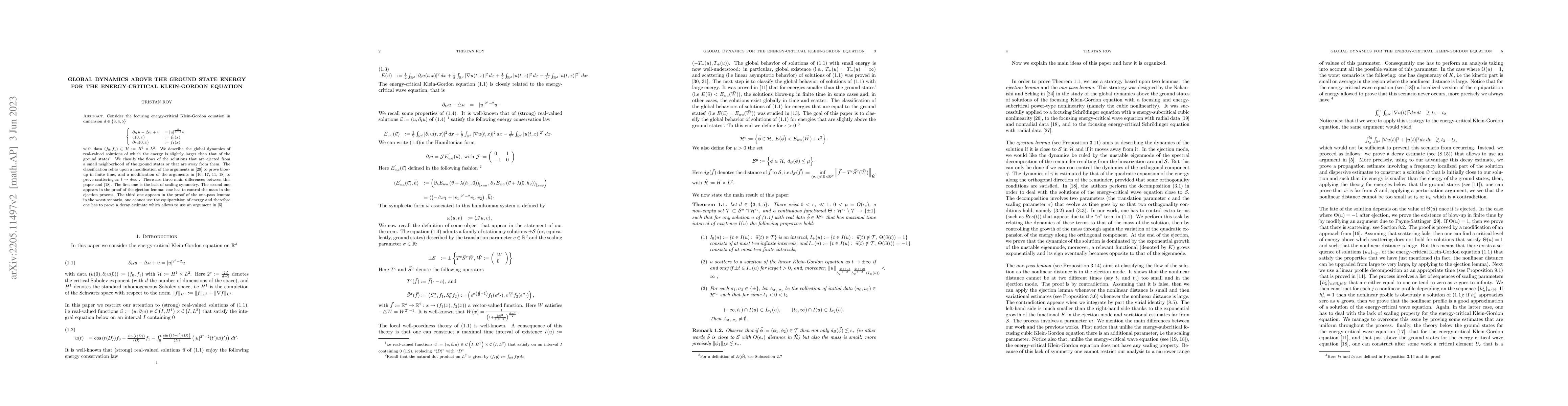 Consider the focusing energy-critical Klein-Gordon equation in dimension d=3,4,5. We describe the global dynamics of real-valued solutions of which the energy is slightly larger than that of the ground states'. We classify the flows of the solutions that are ejected from a small neighborhood of the ground states or that are away from them.