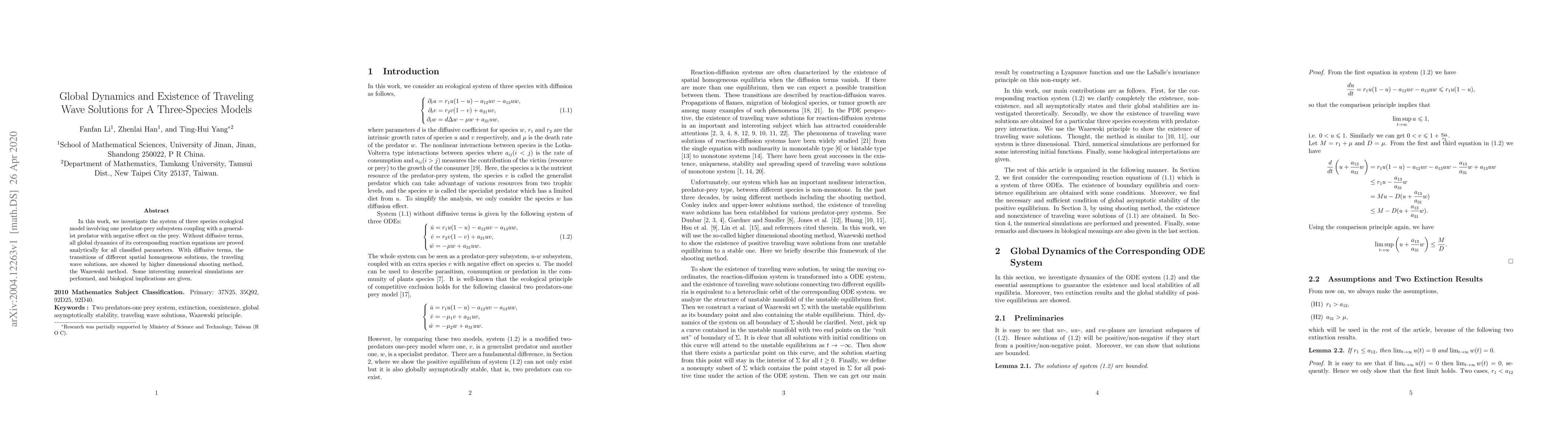 This paper analytically proves the global dynamics of a three-species ecological model without diffusion, and uses advanced methods to demonstrate the existence of traveling wave solutions with diffusion, providing biological implications through numerical simulations.