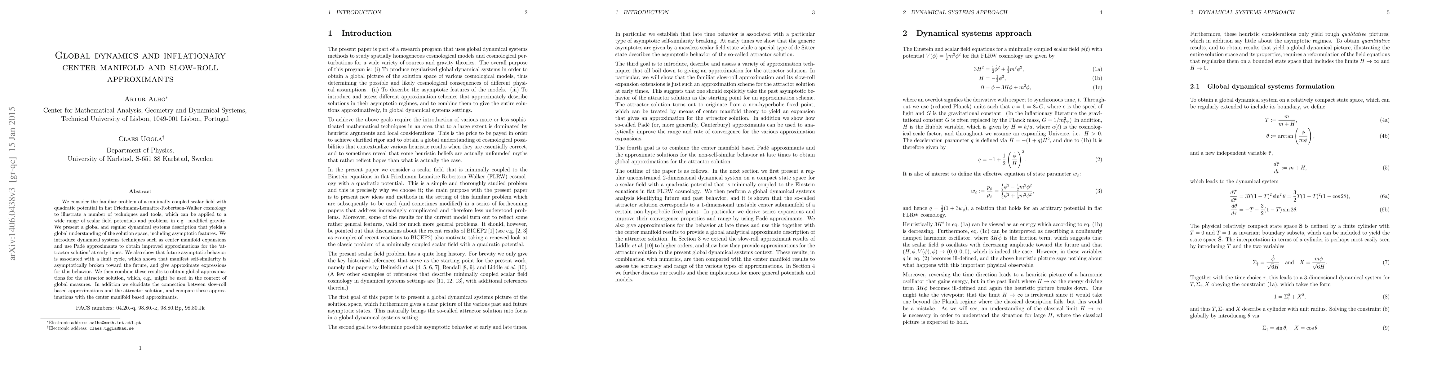 We consider the familiar problem of a minimally coupled scalar field with quadratic potential in flat Friedmann-Lema\^itre-Robertson-Walker cosmology to illustrate a number of techniques and tools, which can be applied to a wide range of scalar field potentials and problems in e.g. modified gravity. We present a global and regular dynamical systems description that yields a global understanding of the solution space, including asymptotic features. We introduce dynamical systems techniques such as center manifold expansions and use Pad\'e approximants to obtain improved approximations for the `attractor solution' at early times. We also show that future asymptotic behavior is associated with a limit cycle, which shows that manifest self-similarity is asymptotically broken toward the future, and give approximate expressions for this behavior. We then combine these results to obtain global approximations for the attractor solution, which, e.g., might be used in the context of global measures. In addition we elucidate the connection between slow-roll based approximations and the attractor solution, and compare these approximations with the center manifold based approximants.