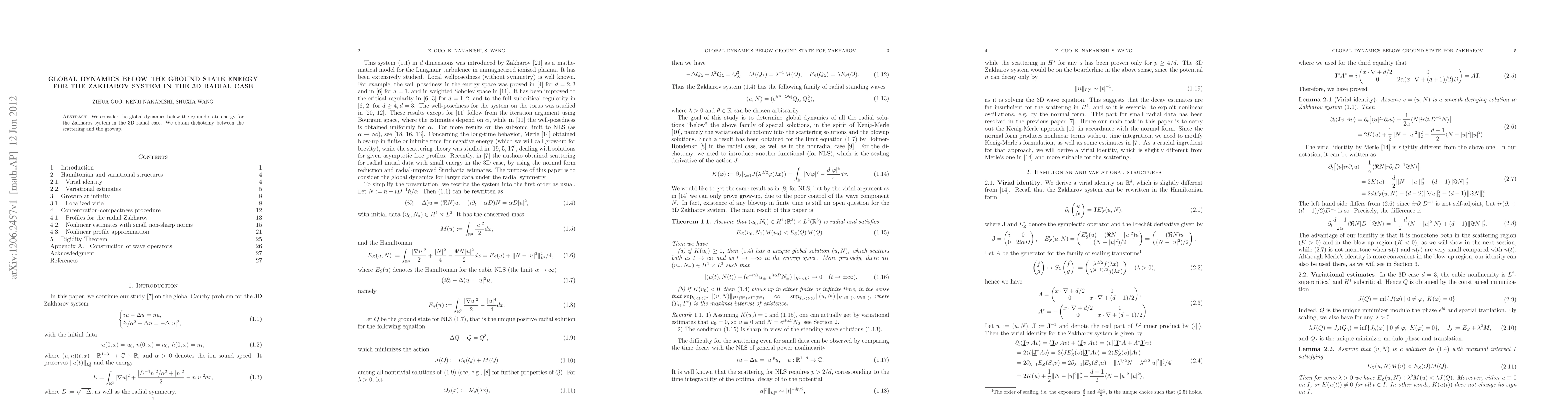 Research investigates global dynamics below ground state energy for Zakharov system in 3D radial case, finding dichotomy between scattering and growth.