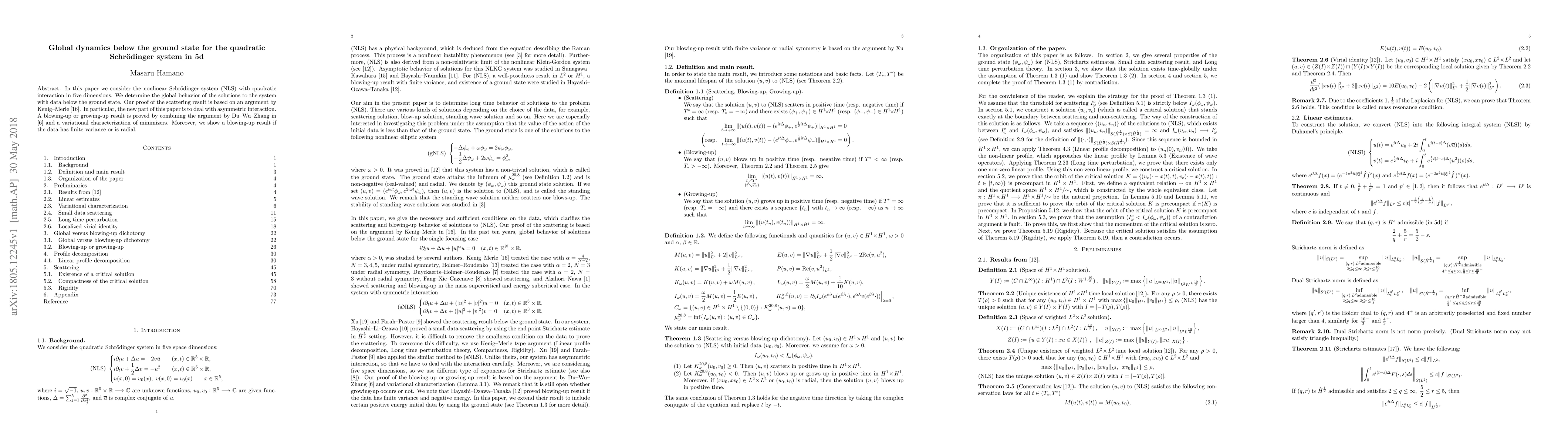 In this paper we consider the nonlinear Schr\"odinger system (NLS) with quadratic interaction in five dimensions. We determine the global behavior of the solutions to the system with data below the ground state. Our proof of the scattering result is based on an argument by Kenig Merle [16]. In particular, the new part of this paper is to deal with asymmetric interaction. A blowing up or growing up result is proved by combining the argument by Du Wu Zhang in [6] and a variational characterization of minimizers. Moreover, we show a blowing-up result if the data has finite variance or is radial.
