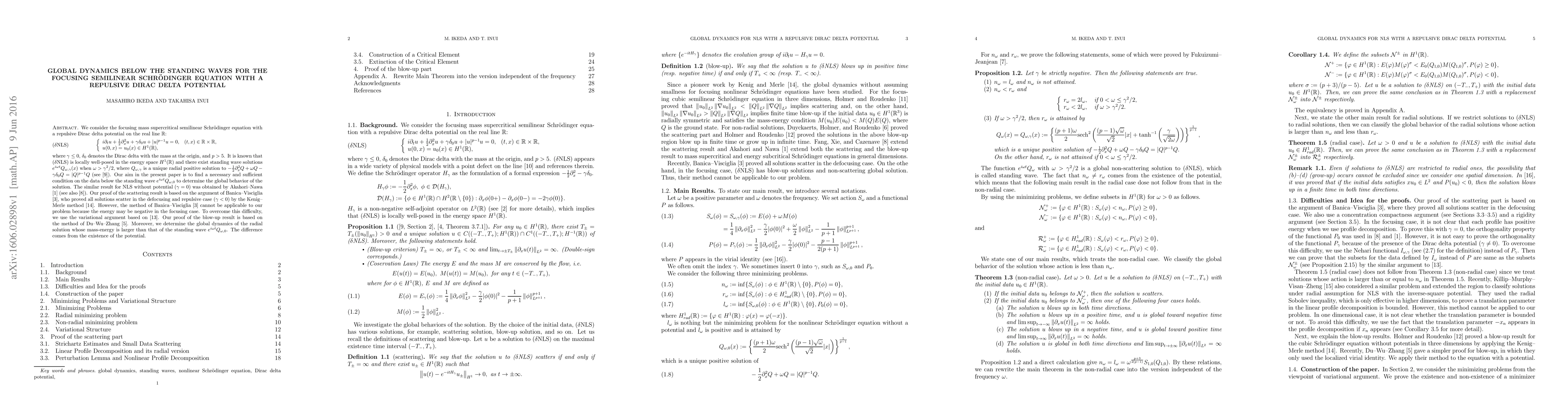This paper investigates the focusing mass supercritical semilinear Schrödinger equation with a repulsive Dirac delta potential, aiming to establish a necessary and sufficient condition for the global dynamics of solutions below the standing wave threshold, determining the behavior of radial solutions with mass-energy between that of the standing wave and the deltaNLS standing wave.