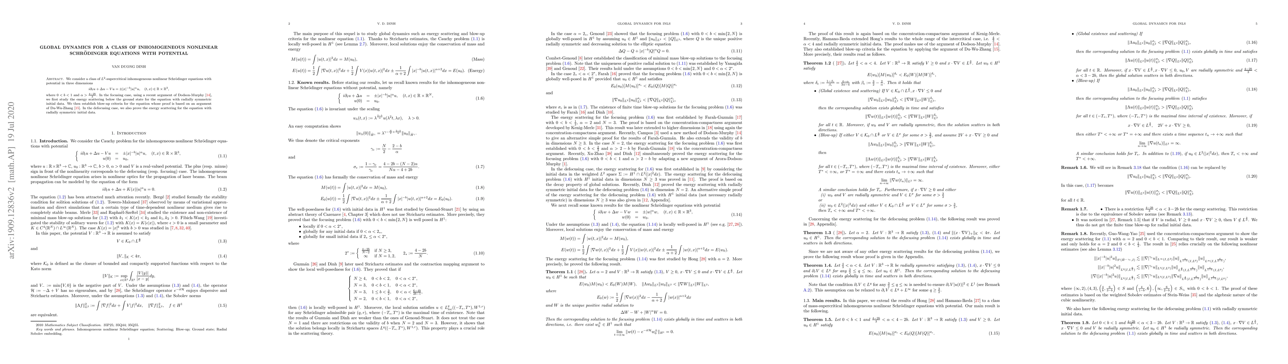 This paper studies global dynamics for a class of inhomogeneous nonlinear Schr"odinger equations with potential, focusing on energy scattering and blow-up criteria for both focusing and defocusing cases.