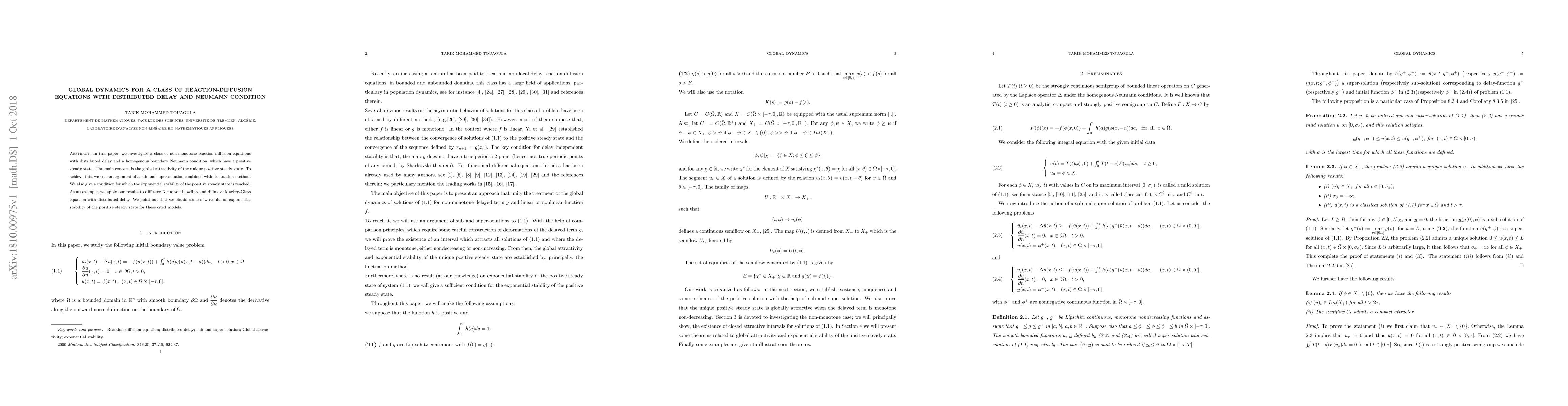 In this paper, we investigate a class of non-monotone reaction-diffusion equations with distributed delay and a homogenous boundary Neumann condition, which have a positive steady state. The main concern is the global attractivity of the unique positive steady state. To achieve this, we use an argument of a sub and super-solution combined with fluctuation method. We also give a condition for which the exponential stability of the positive steady state is reached. As an example, we apply our results to diffusive Nicholson blowflies and diffusive Mackey-Glass equation with distributed delay. We point out that we obtain some new results on exponential stability of the positive steady state for these cited models.