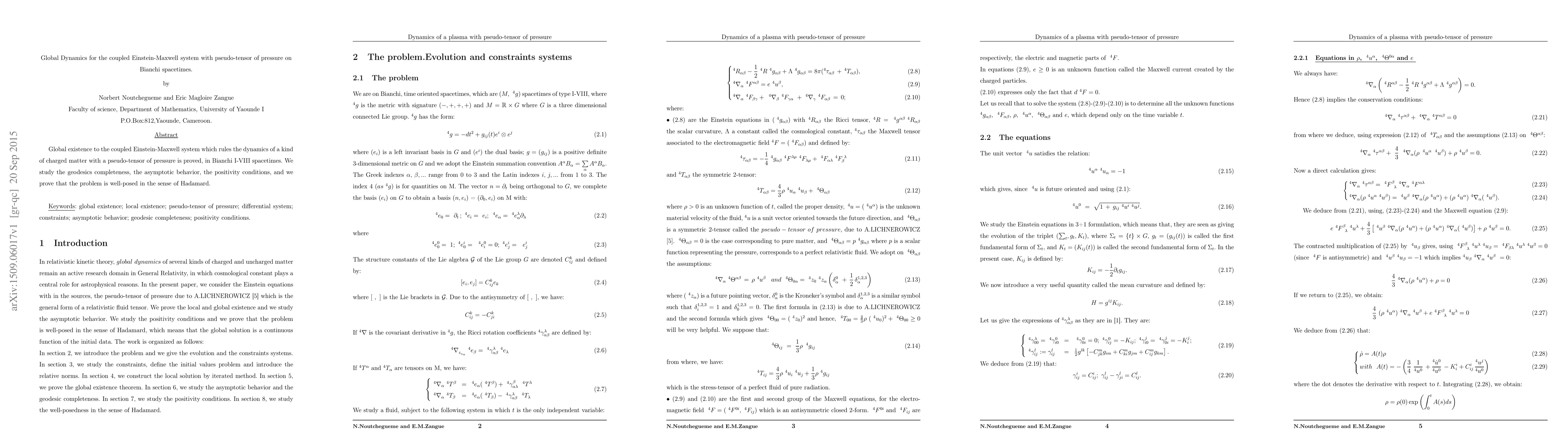 Global existence to the coupled Einstein-Maxwell system which rules the dynamics of a kind of charged matter with a pseudo-tensor of pressure is proved, in Bianchi I-VIII spacetimes. We study the geodesics completeness, the asymptotic behavior, the positivity conditions, and we prove that the problem is well-posed in the sense of Hadamard.