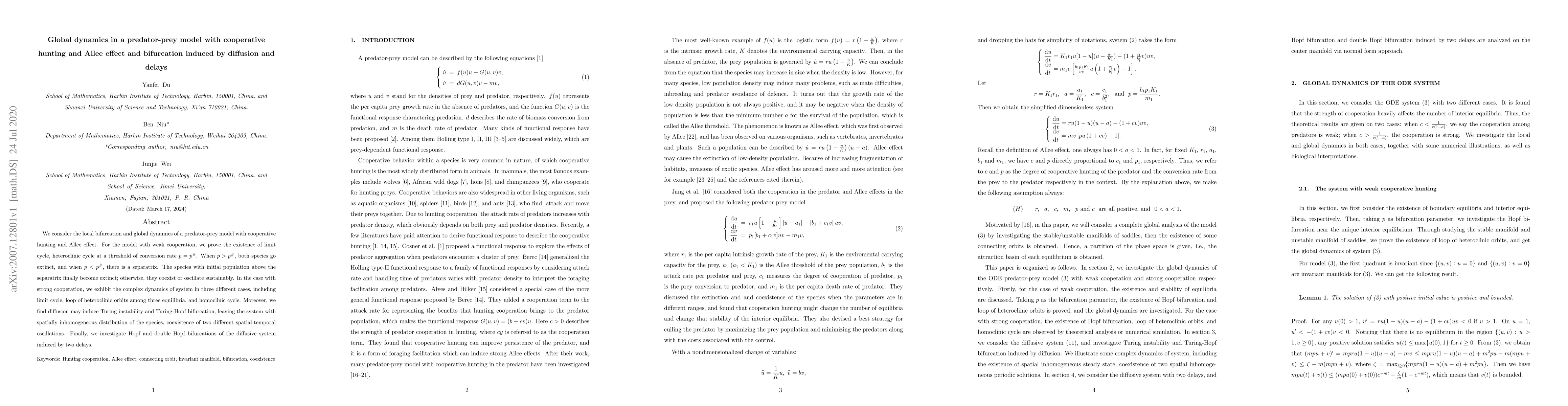 This paper studies the dynamics of a predator-prey model incorporating cooperative hunting and Allee effect, revealing complex behaviors such as limit cycles, heteroclinic cycles, and extinction thresholds. It also explores the impact of diffusion and delays, leading to Turing instability and bifurcations that result in spatially inhomogeneous species distributions and various temporal oscillations.