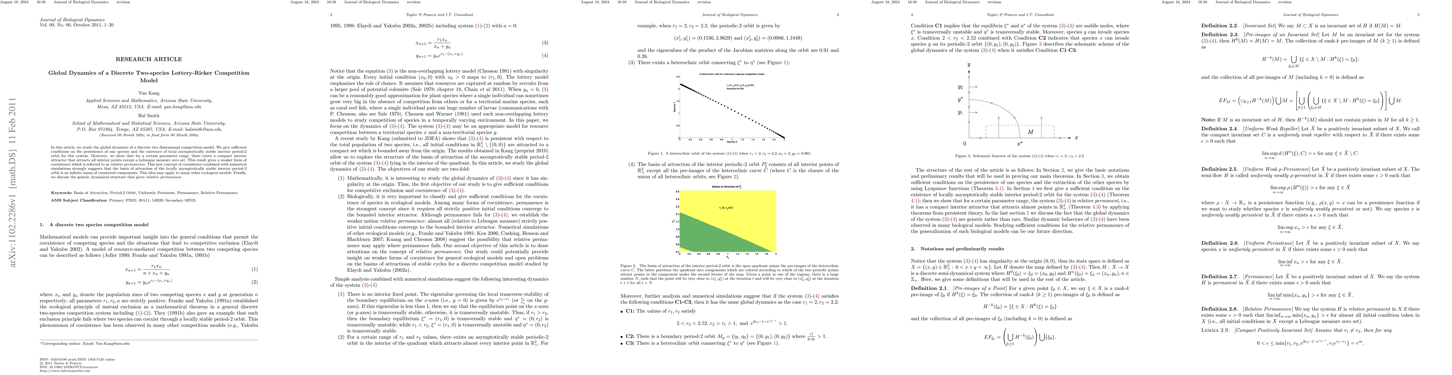 This paper investigates the global dynamics of a discrete two-species competition model, establishing conditions for species persistence and the existence of a stable period-2 orbit. It introduces a new concept of relative permanence and suggests that the basin of attraction for this orbit comprises an infinite union of connected components, potentially applicable to broader ecological models.